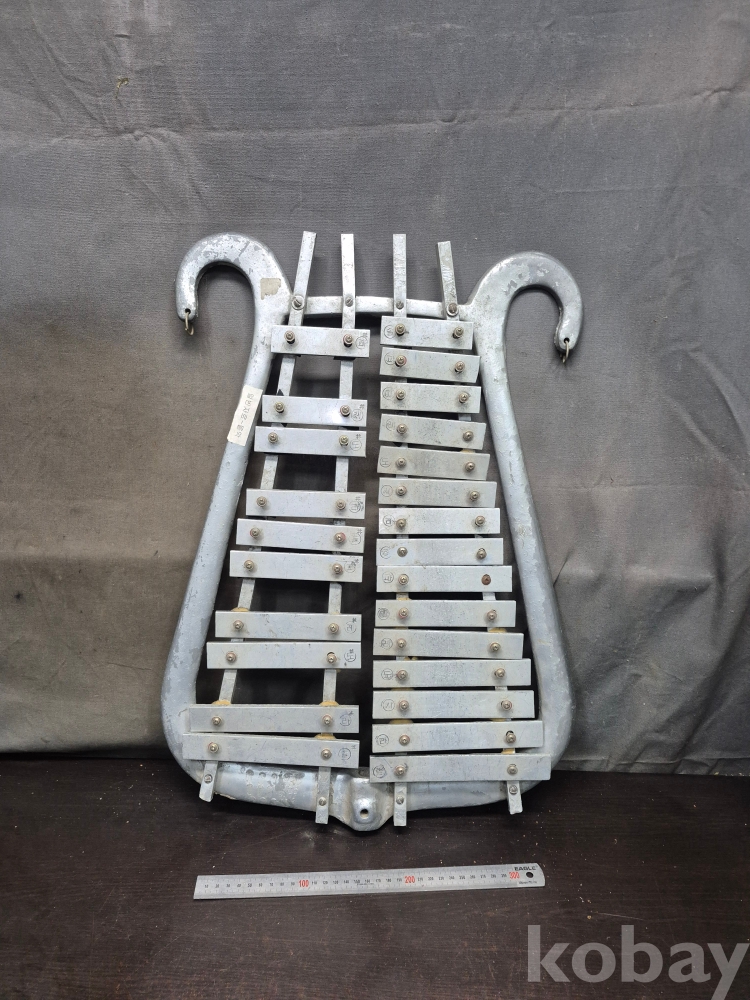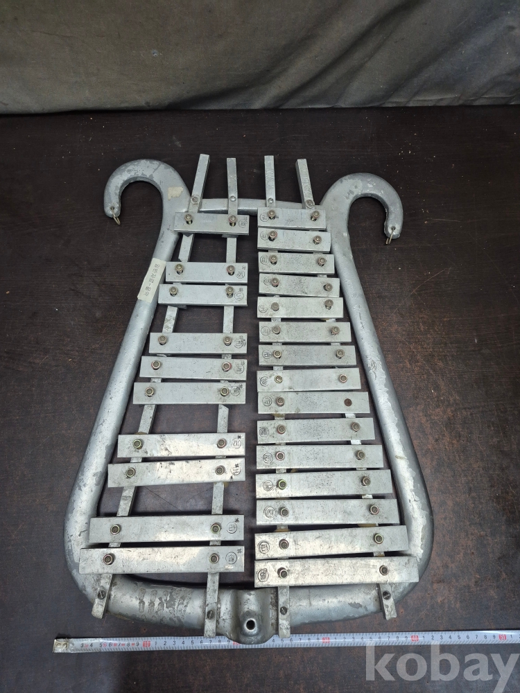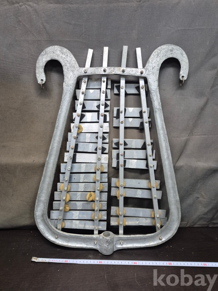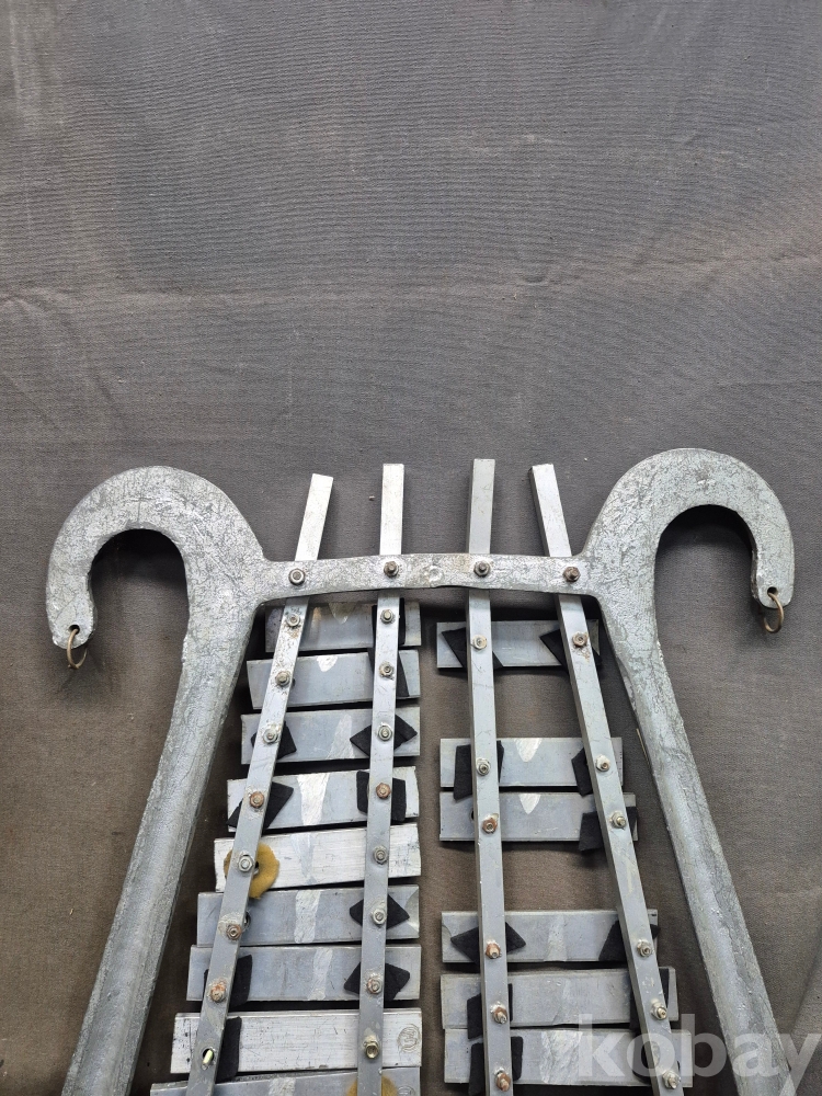 1960-70년대 사용하던 행진할때 쓰이는 벨리라 실로폰 과 원목 채 재질 알루미늄/ 주석 모르겟음 나사 빠짐 있어요 43*60*5