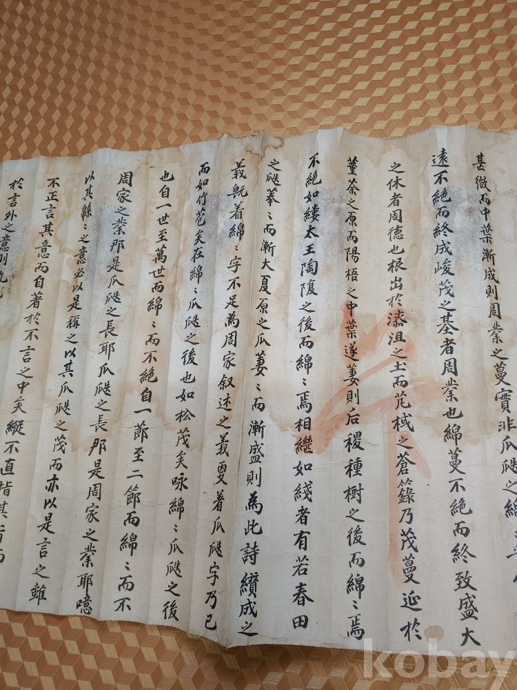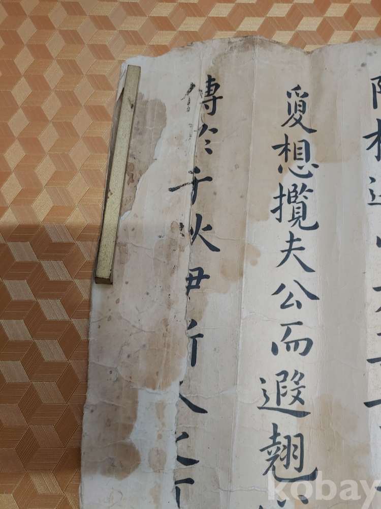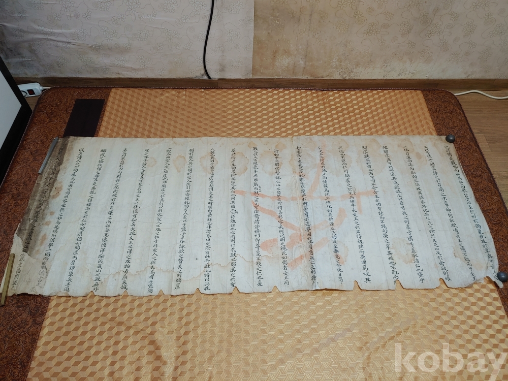 妃掑로 시작하는 고문서...얇은 한지이며 길이가 아주 긴 고문서 끝부분에 배접과 하단에 세월의 흔적이 있음 171.5*70