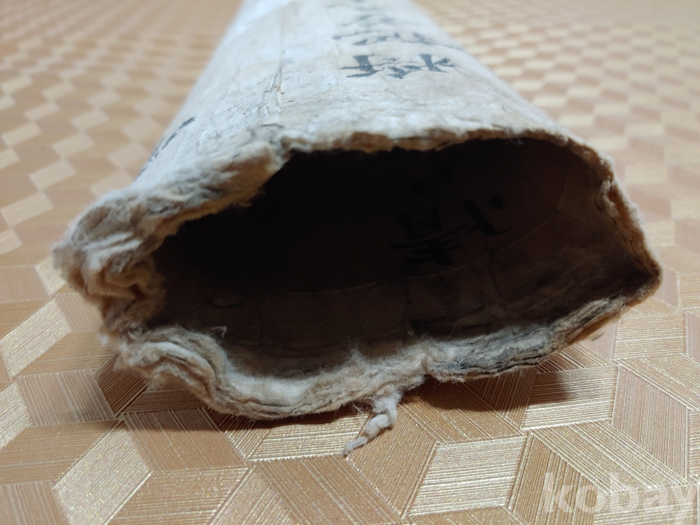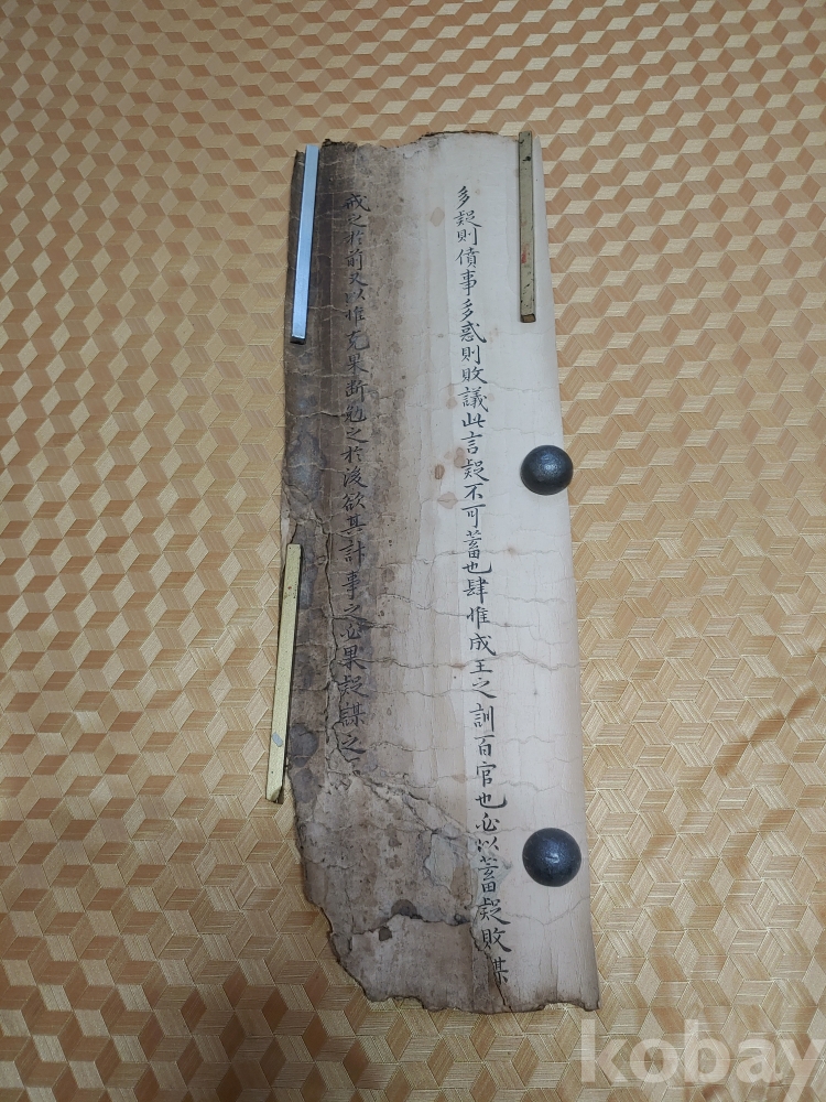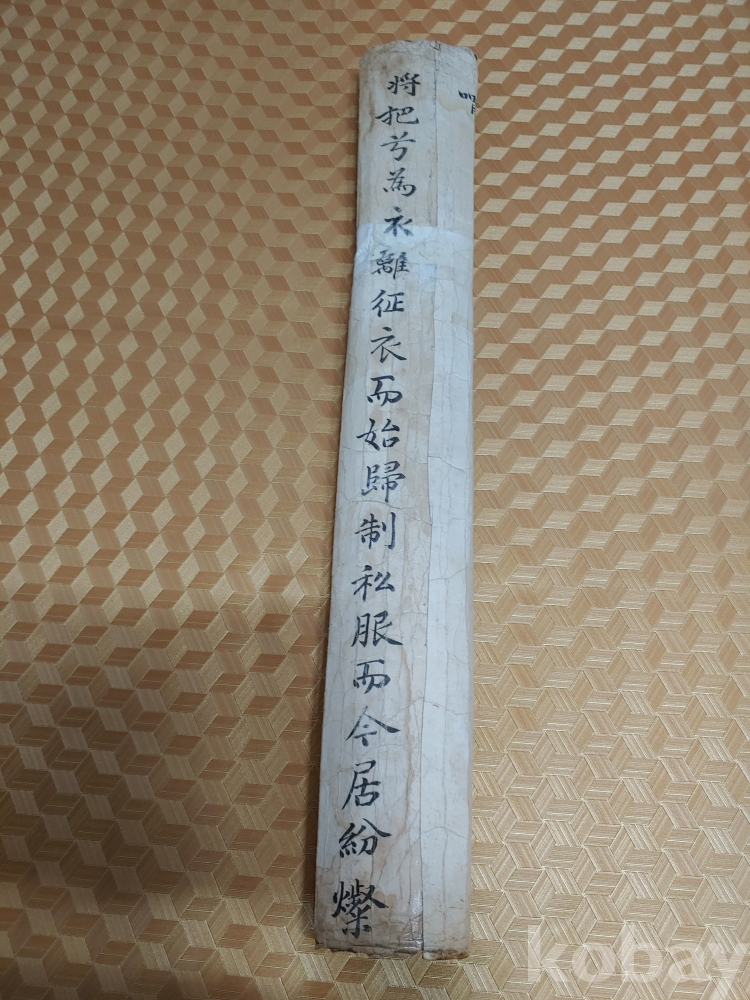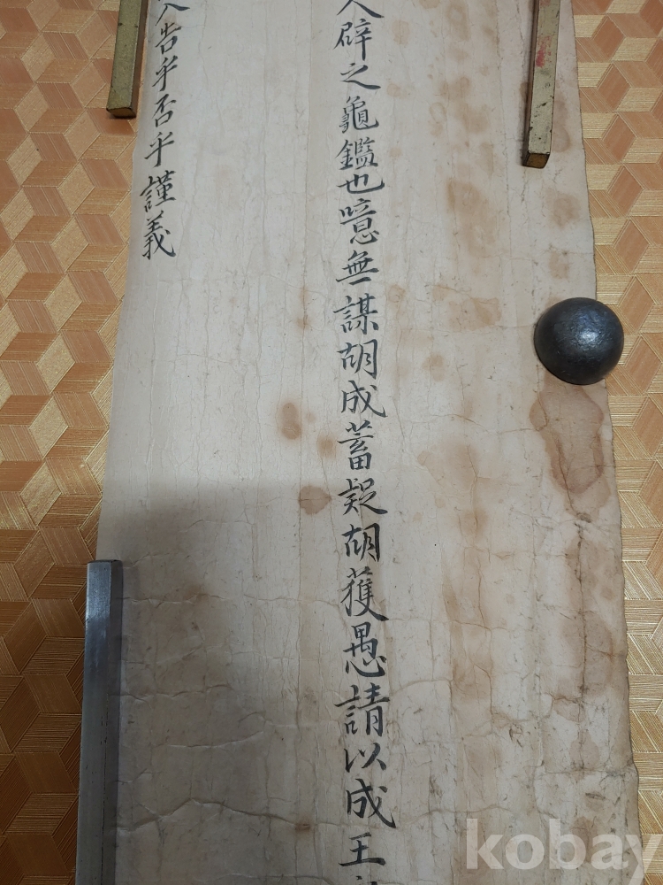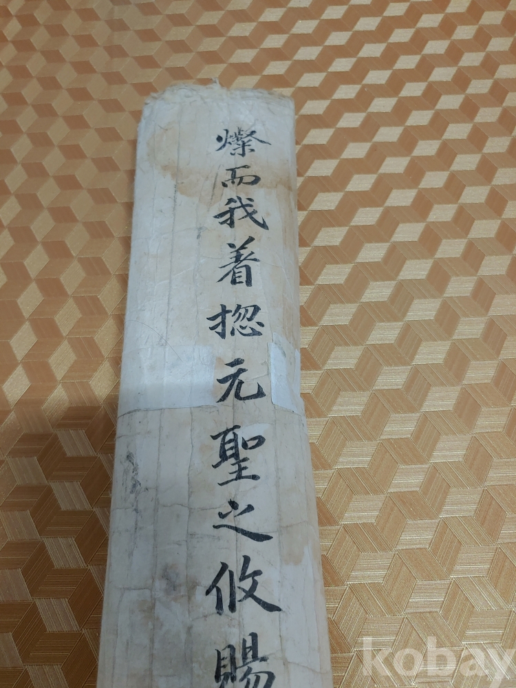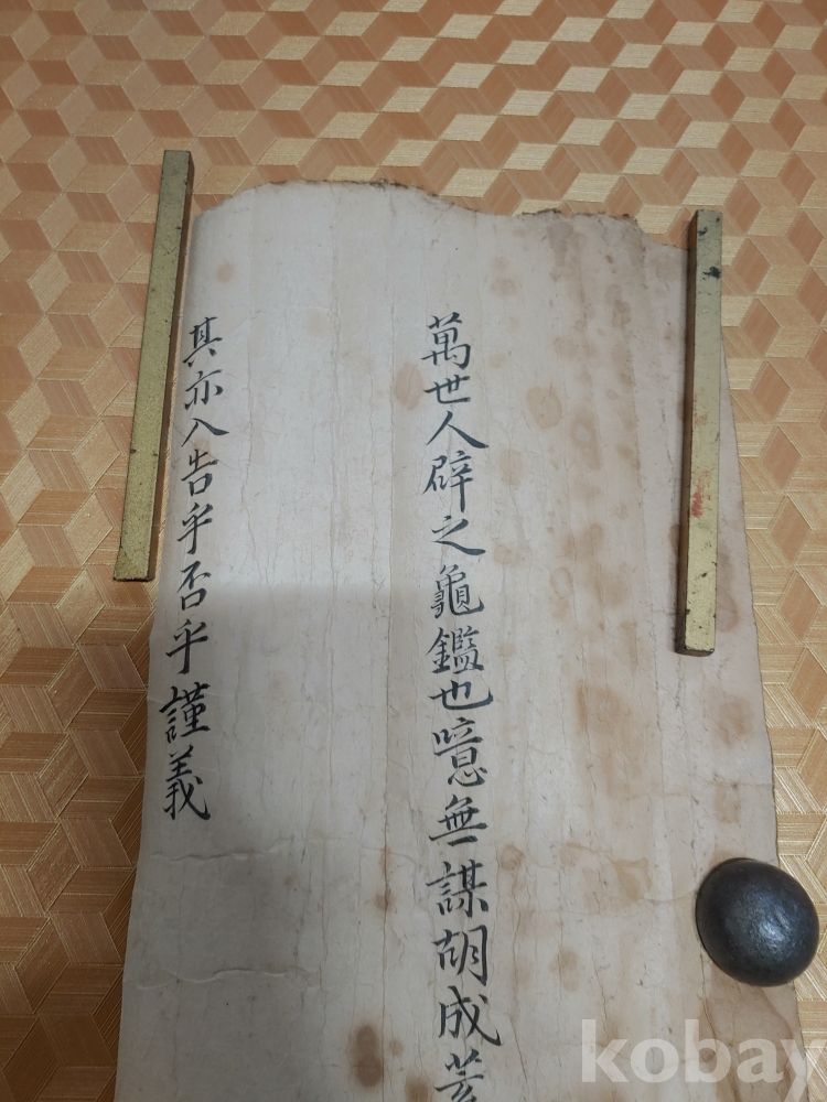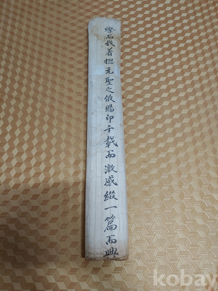 萬世人으로 시작하는 폭이 좁은 고문서...아주 두툼한 장지이며 끝부분에 세월의 흔적과 얼룩이 있음 22*70