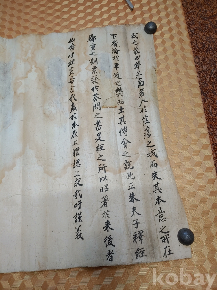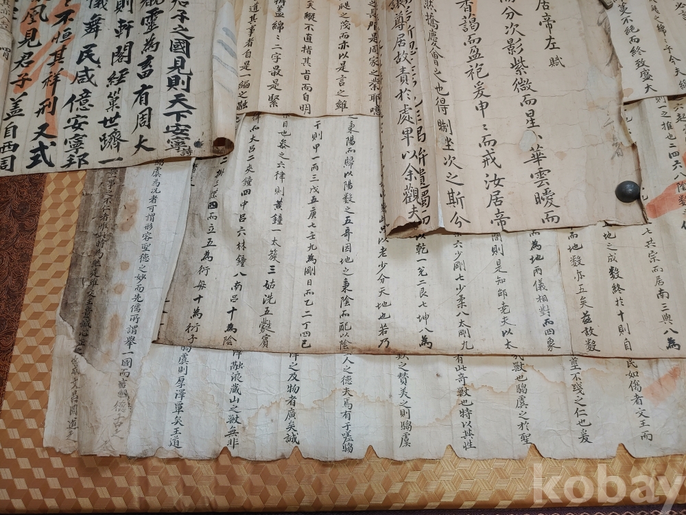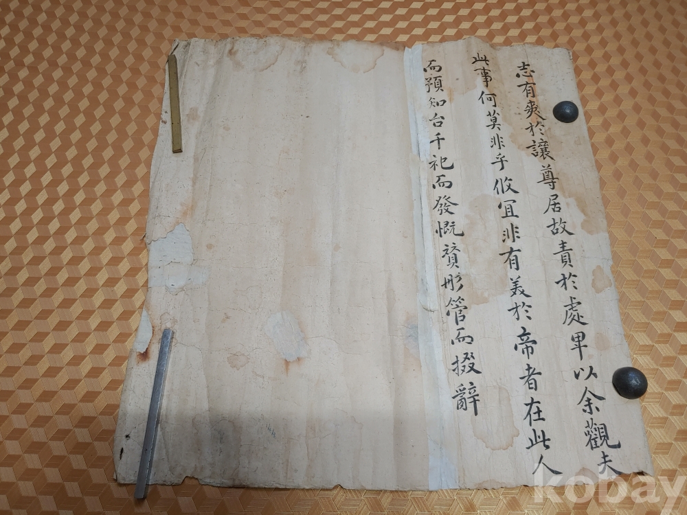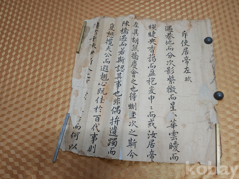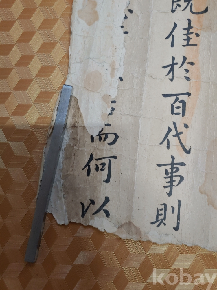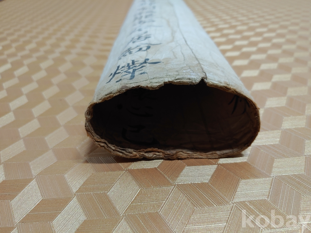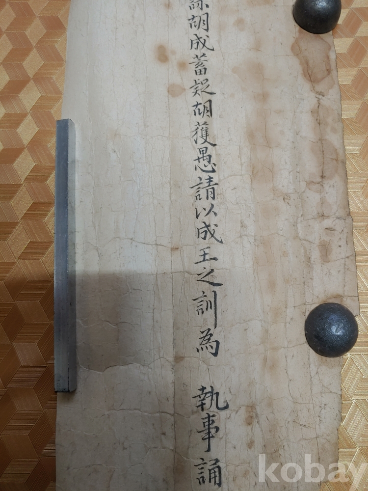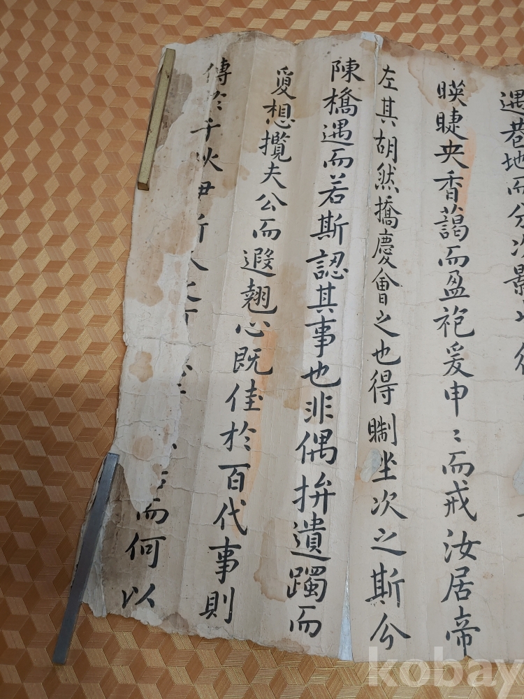 萬世人으로 시작하는 폭이 좁은 고문서...아주 두툼한 장지이며 끝부분에 세월의 흔적과 얼룩이 있음 22*70