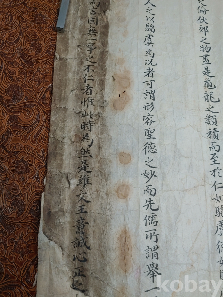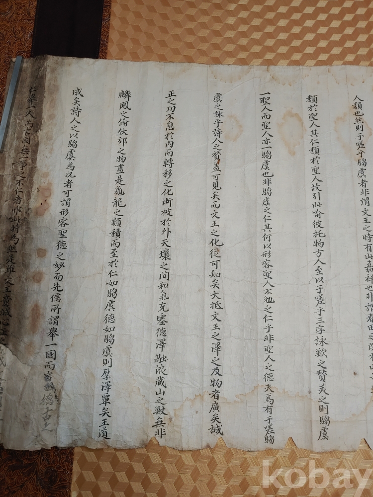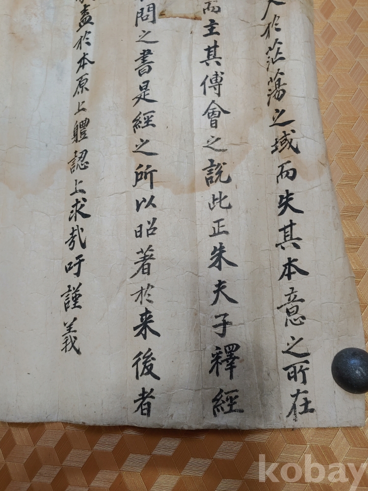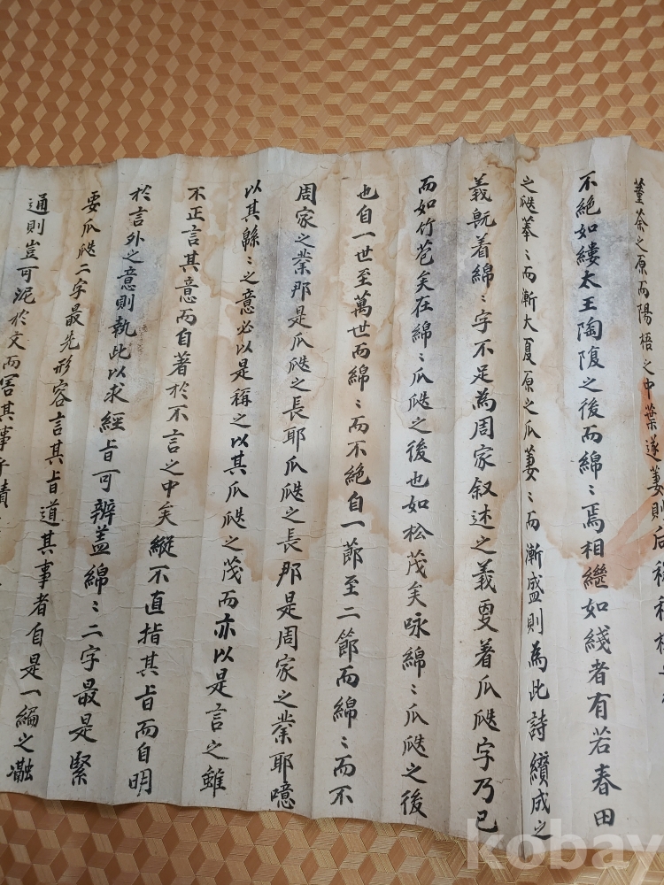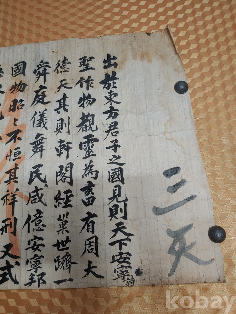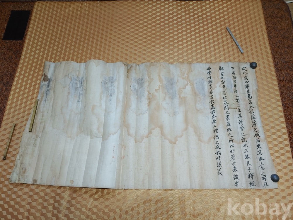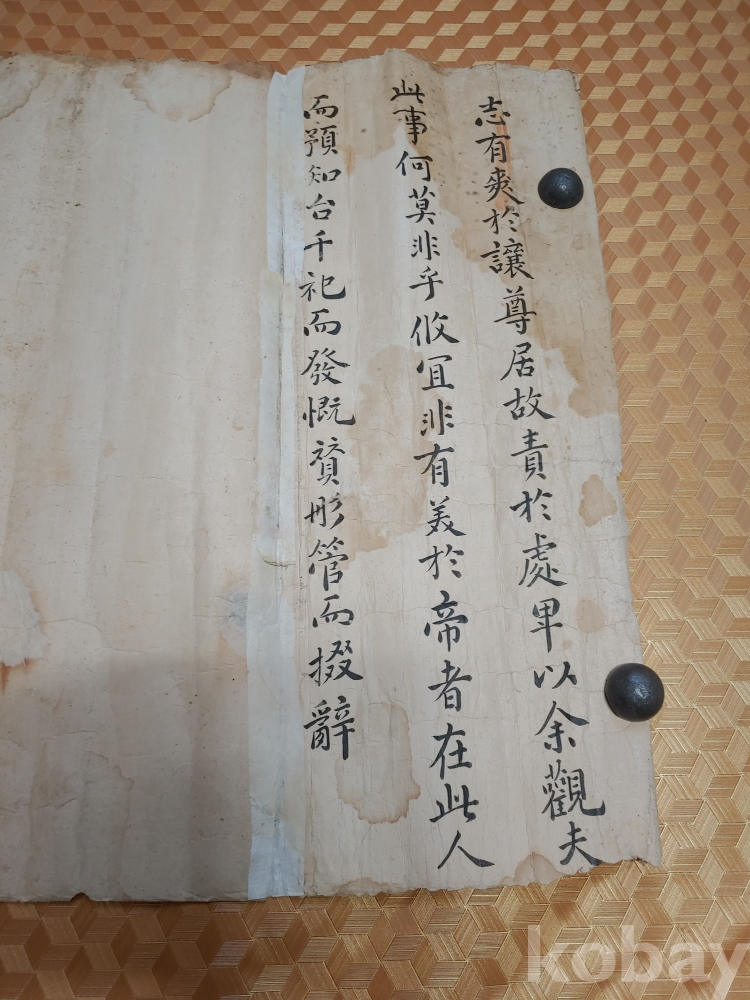 萬世人으로 시작하는 폭이 좁은 고문서...아주 두툼한 장지이며 끝부분에 세월의 흔적과 얼룩이 있음 22*70