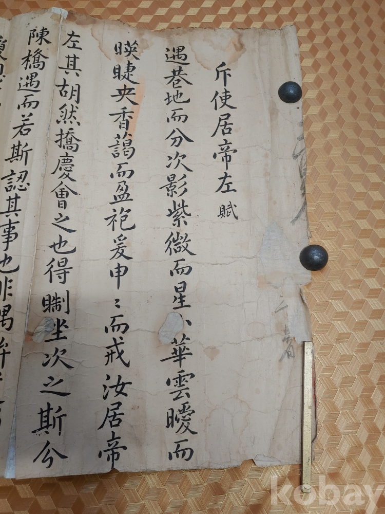 斤使居로 시작하는 고문서...아주 두툼한 장지이며 앞부분이 짤여져 있으며 끝부분에 세월의 흔적이 있음 65*67