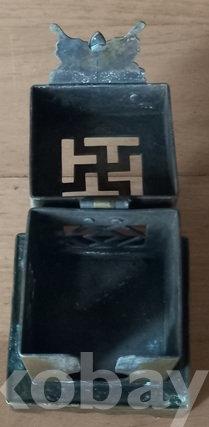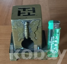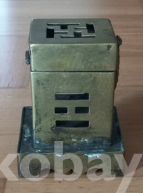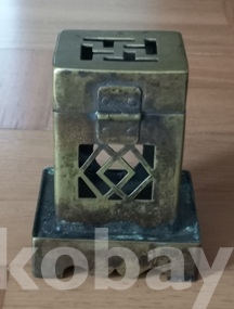 황동으로 담배통과 받침이 4각형이고 뚜껑의 가운데에 卍자문이 그리고 전면에 범나비조각을 부착하여 한층 고급스럽게 만들었읍니다. 통의 앞면에 담배통이 들어가는 둥근 구멍이, 반대쪽에는 쌍마름모 모양이, 또다른 쪽에는 팔괘의 이離가 대칭으로 투각되어 있읍니다. 한편 이離는 사괘의 불火을 상징한다 하고.. 하여튼 실물로는 정말 대하기 힘든 박물관용 기물이 아닌가 여겨집니다. 제가 전문가가 아니라 연대는 정확치가 않읍니다. 깊이 배인 검푸른 녹소와 세월의 검정 땟물 조차도 아름답기 그지없고.. 상태는 뚜껑의 개폐도 정상 작동되는 등 일체 흠없고 제가 소장한 몇점 휴연대중 가장 디자인이 아름다운것으로 한점 골라 올립니다. 감상, 수집, 소장에 좋은 기회가 되었으면 합니다.