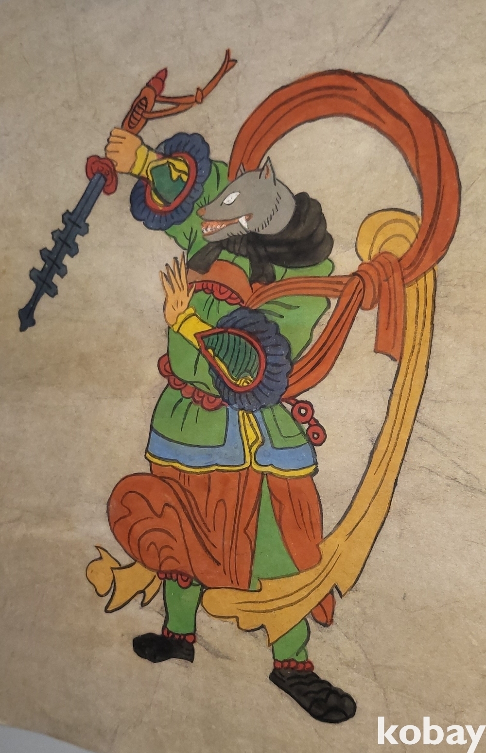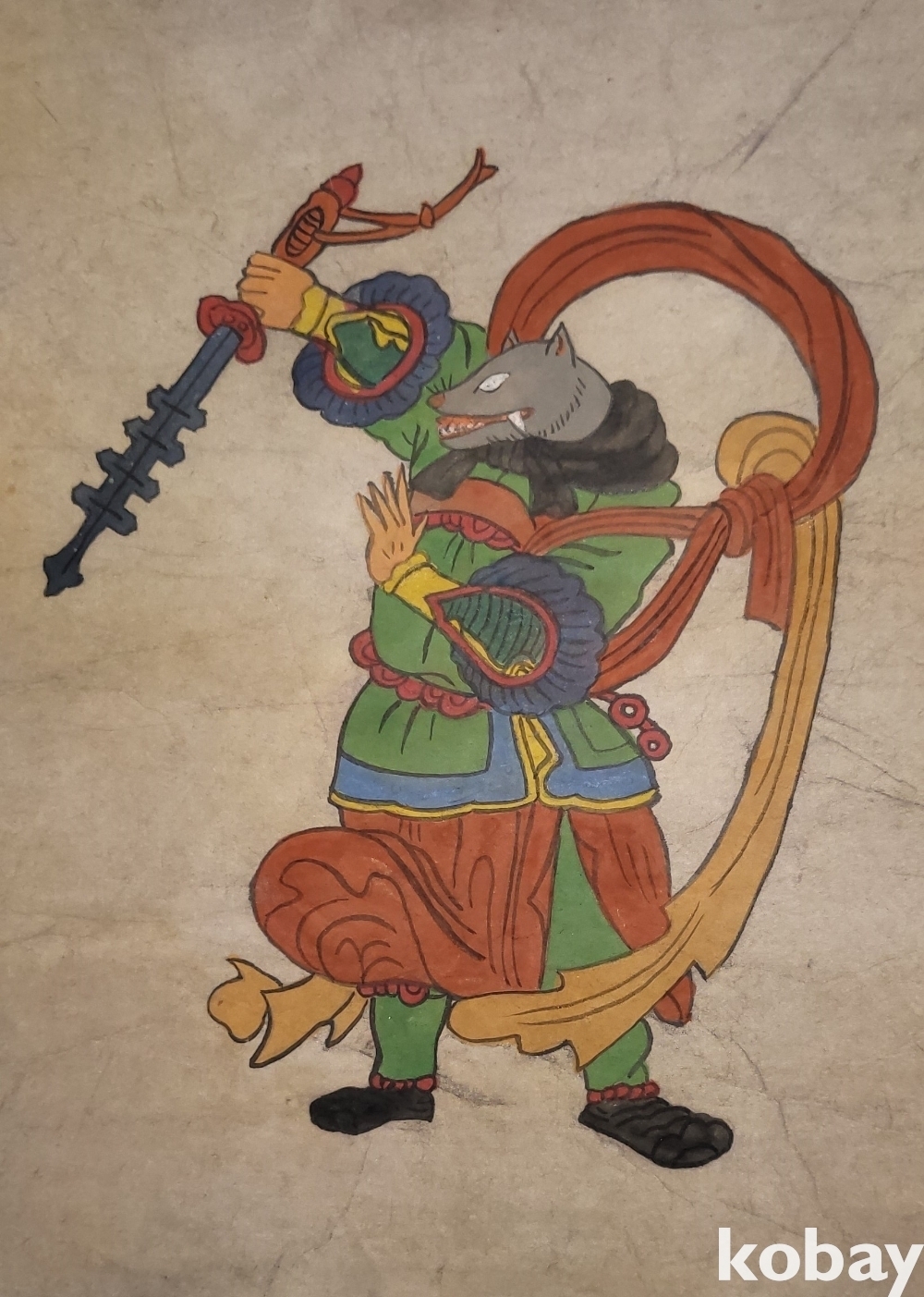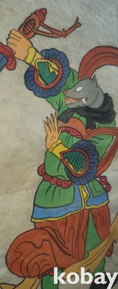 구한말 연대 갖춘 장지 바닥에 당채로 그려진 동물 형상 그림입니다,