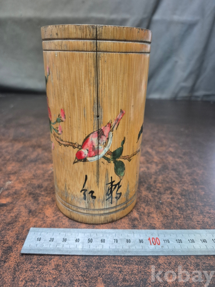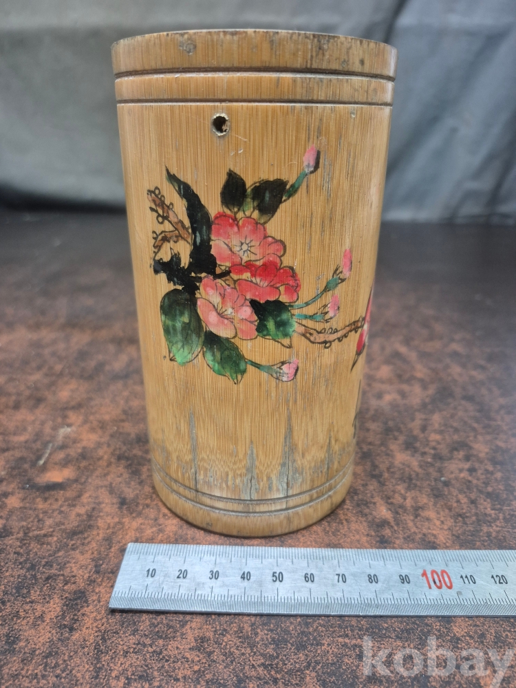 1975년 6월 8일 실사용하던 수저통 재질 대나무를 깍아 만들고 참새와 목단이 그려져 있어요 8.5*8.5*15