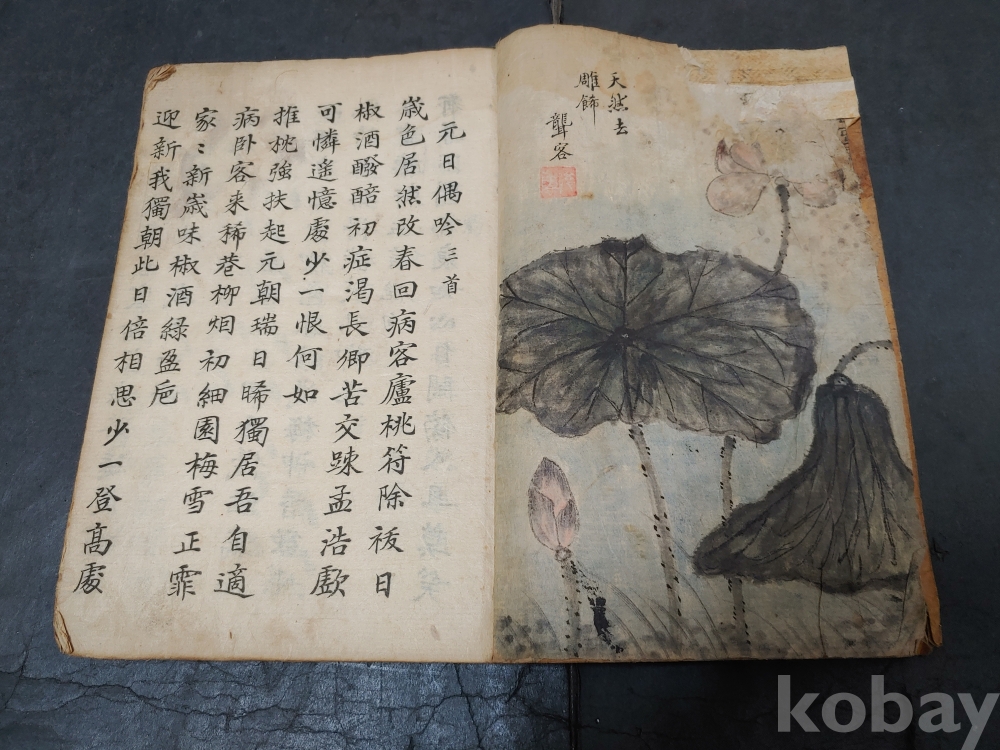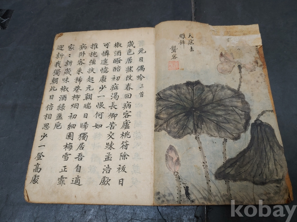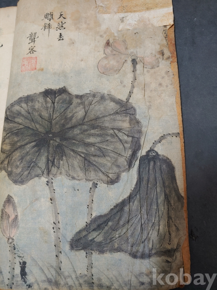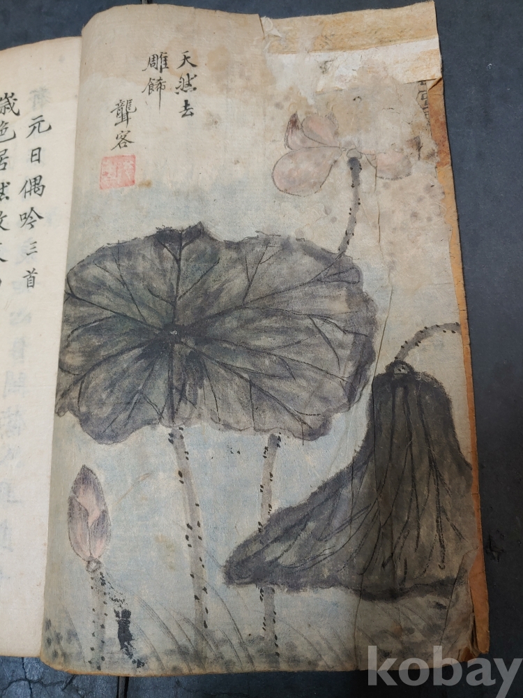 ""조선후기 영조시대의 실학자 농객(聾客) 유수원(柳壽垣 1694-1755)이 그린 연꽃 매화 새 그림이 앞뒤 페이지에 그려져 있으며 단정하게 잘 필사를 한 고 필사본""