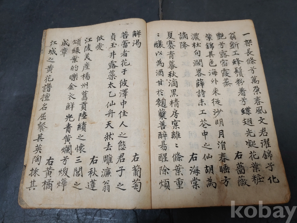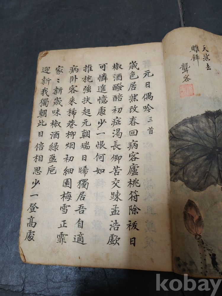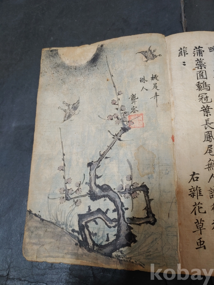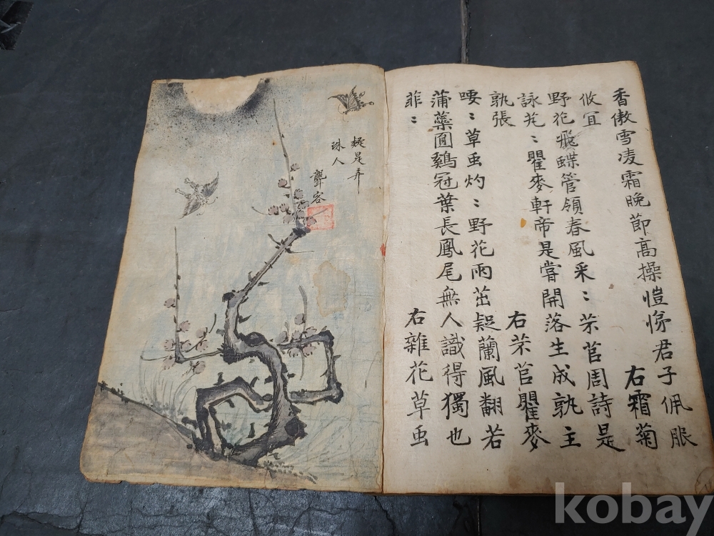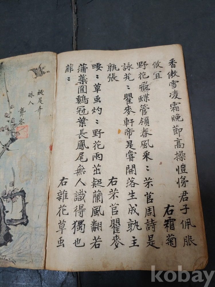 ""조선후기 영조시대의 실학자 농객(聾客) 유수원(柳壽垣 1694-1755)이 그린 연꽃 매화 새 그림이 앞뒤 페이지에 그려져 있으며 단정하게 잘 필사를 한 고 필사본""