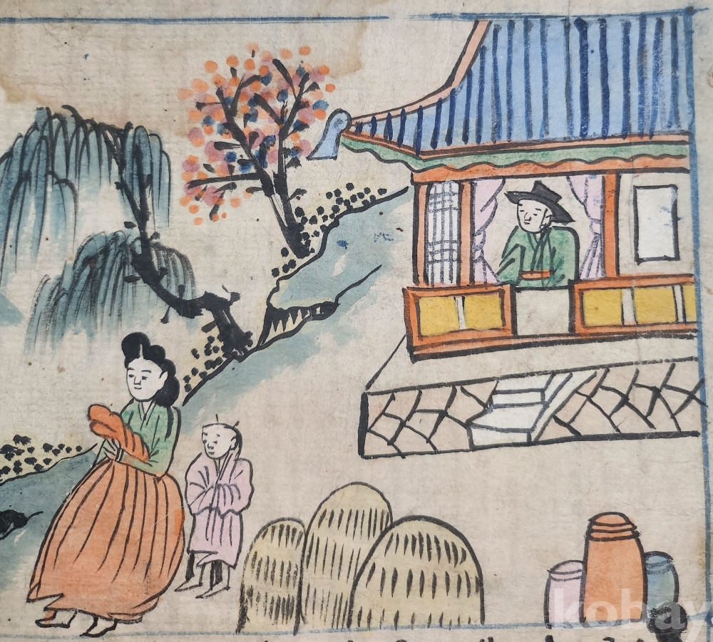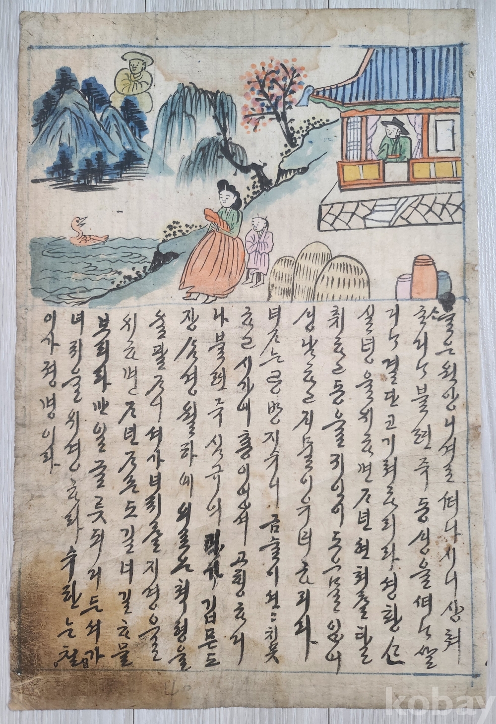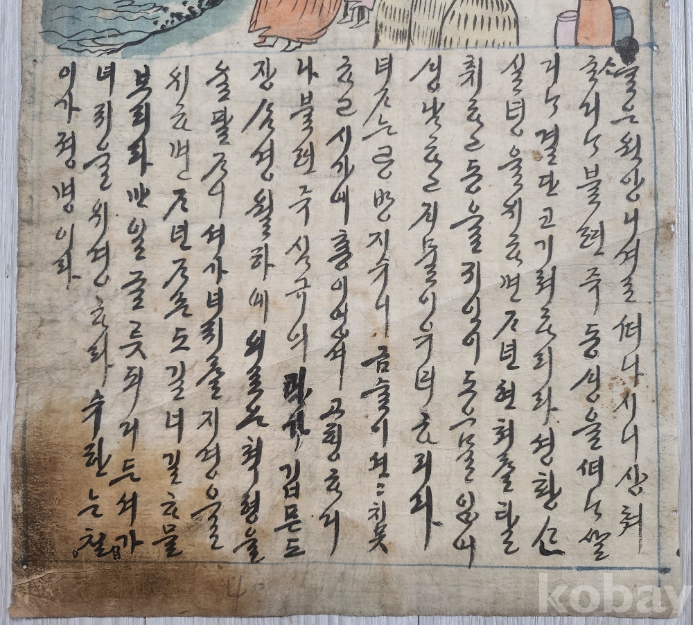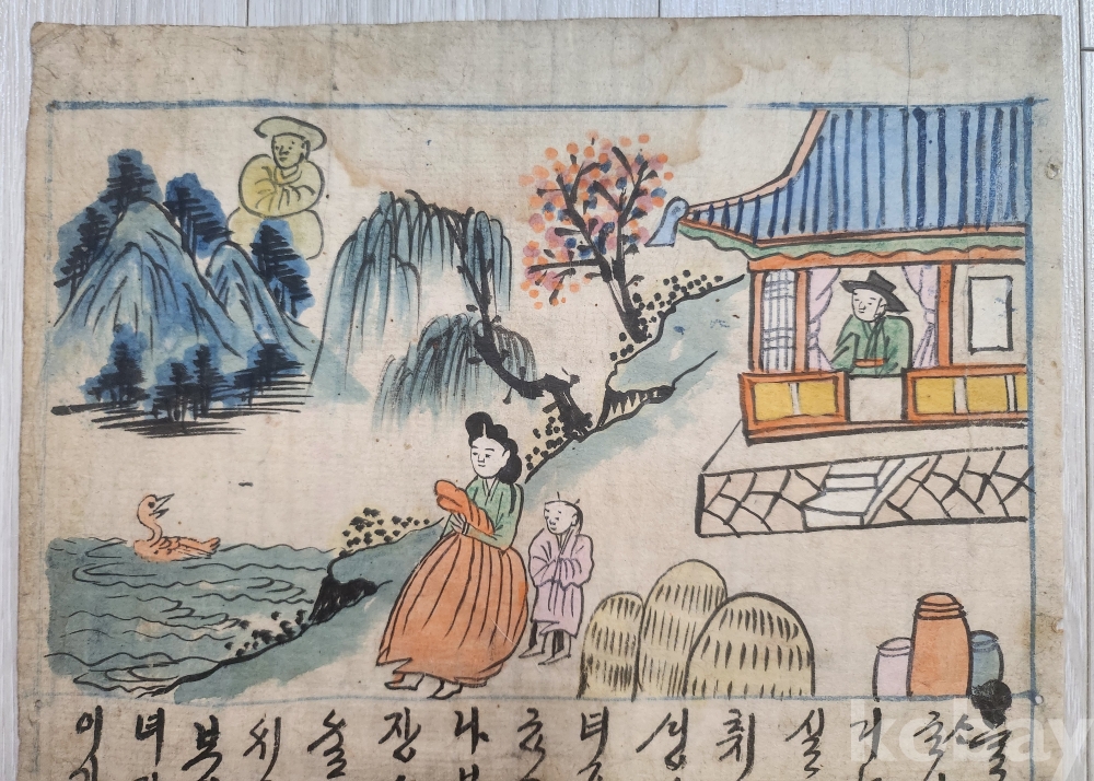조선시대 장지에 당채그림과 아래에 궁서체글씨가 쓰여져 있습니다 당대에 질좋은장지에 그려진것입니다 접하기 쉽지 않은 그림 입니다