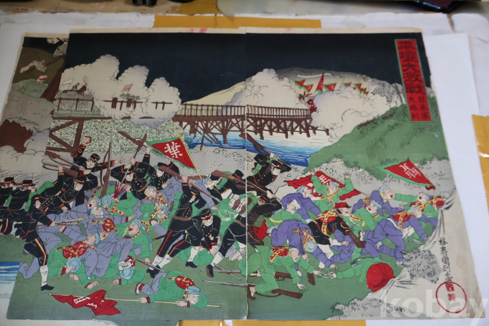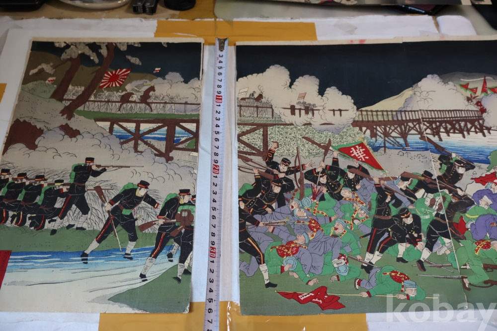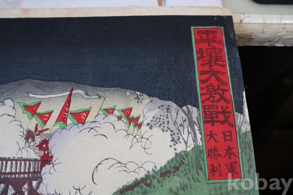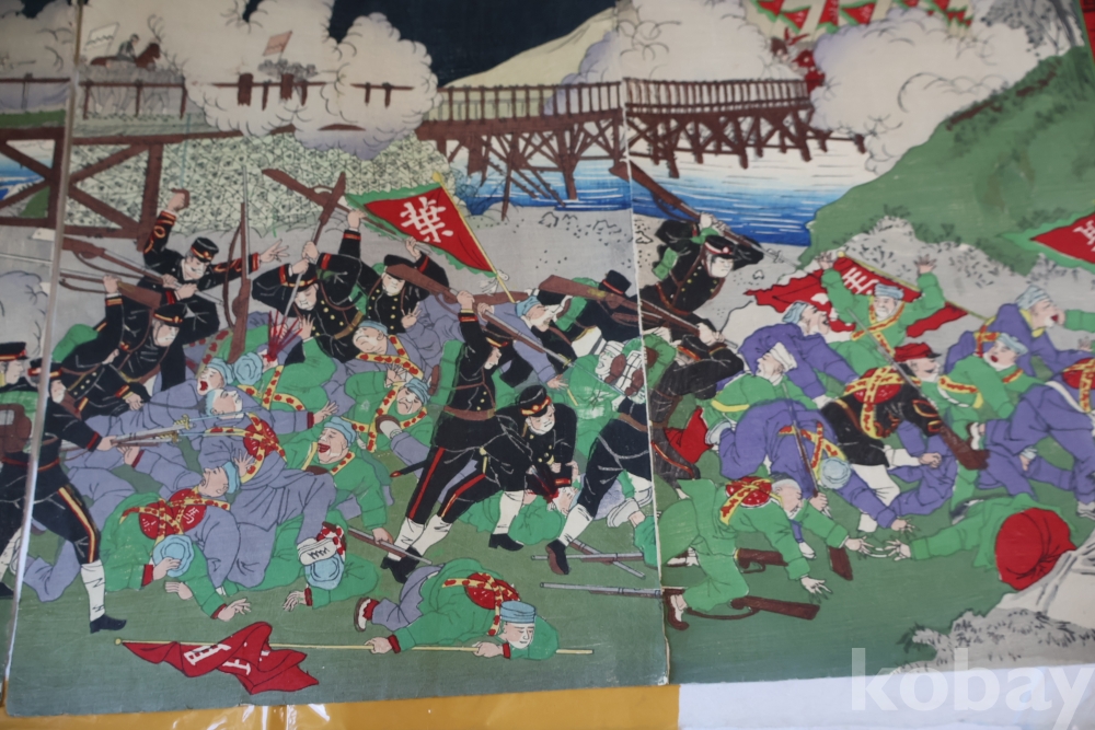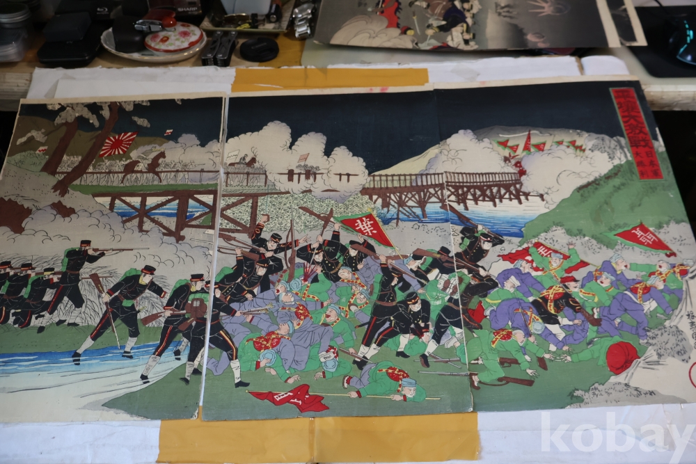 청군과 일본 군의 전쟁 평양 임니다 당시 전쟁 상황을 알린 오리지날 목판화 3 세트 연결 화 이며 세월의 흔적을 가진 귀한 목판화 임니다