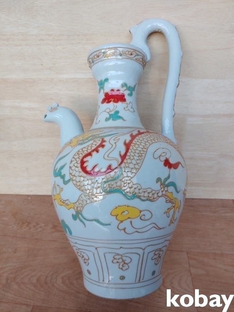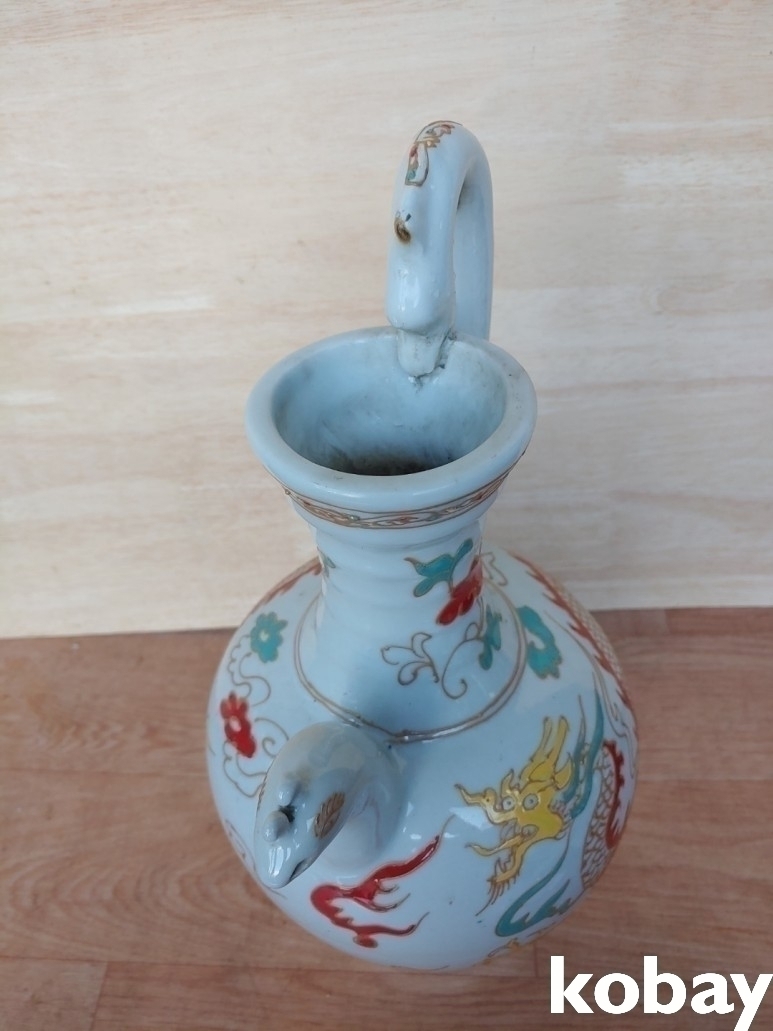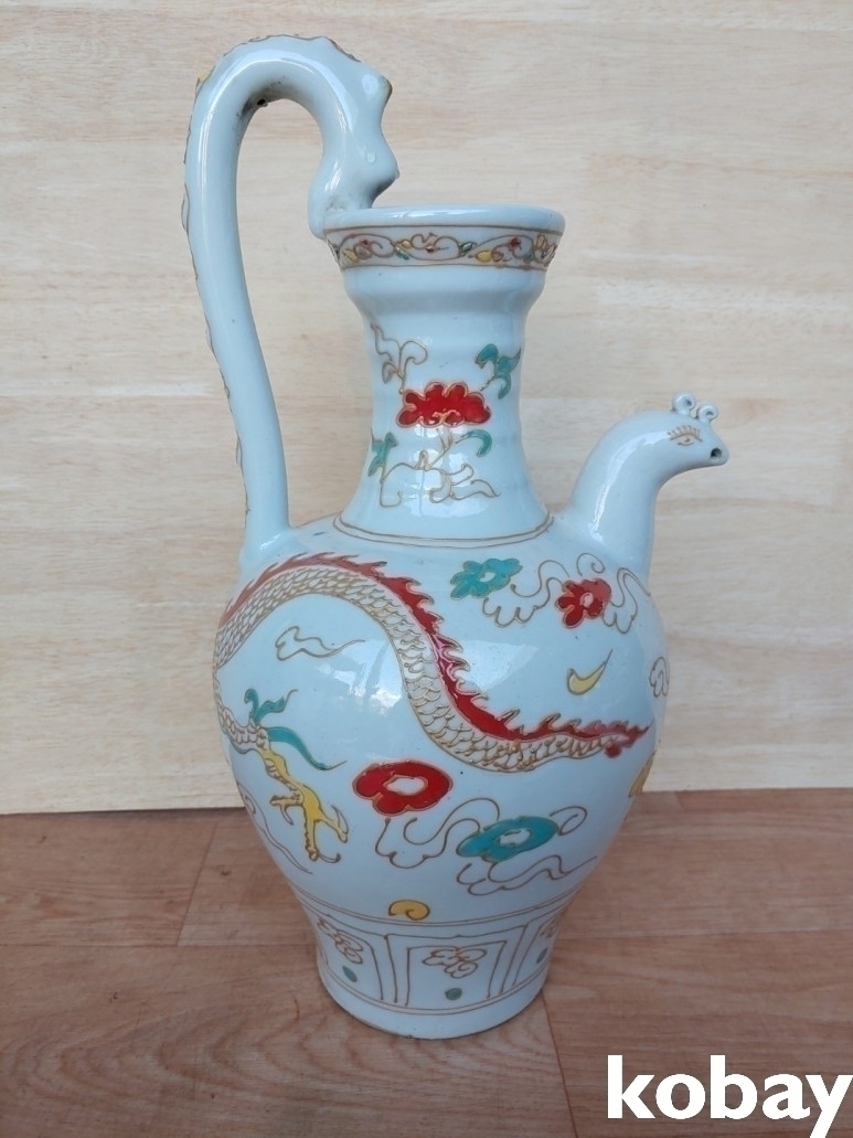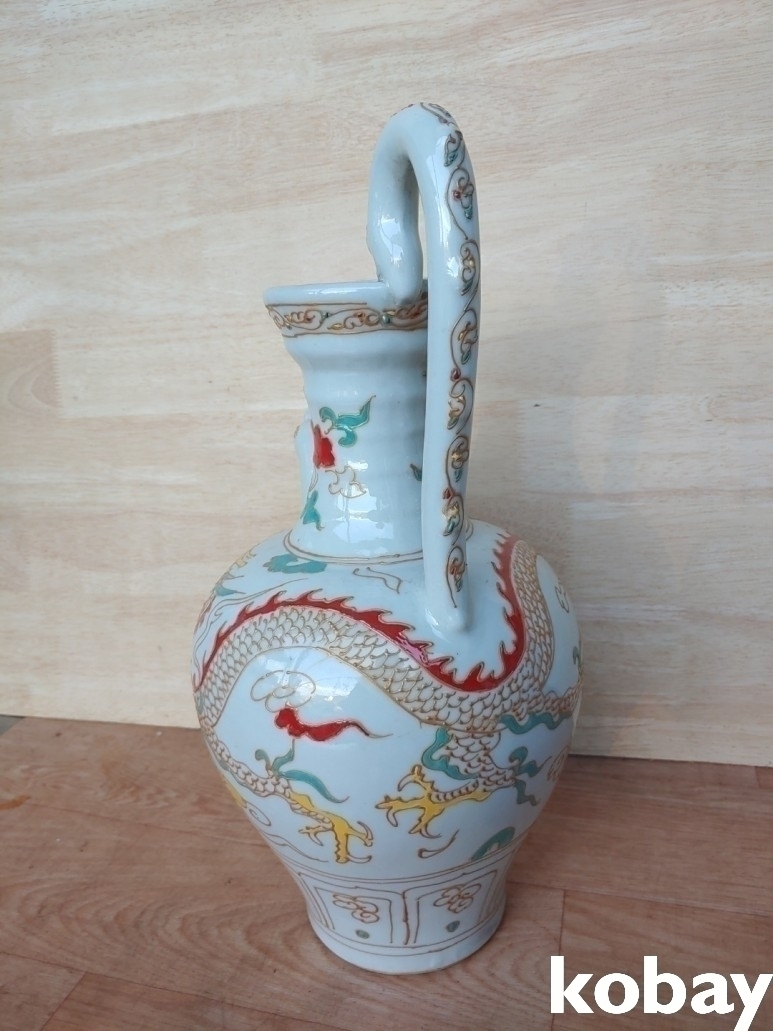 용 문양에 용 손잡이가 있는 주전자 도자기 입니다.