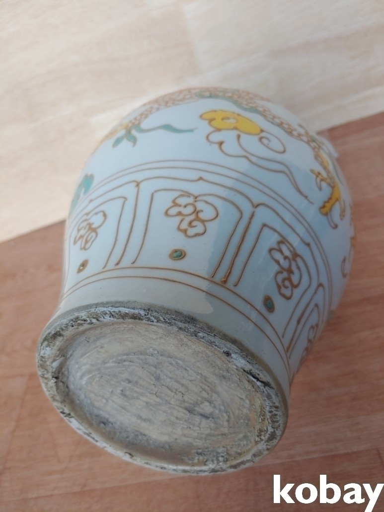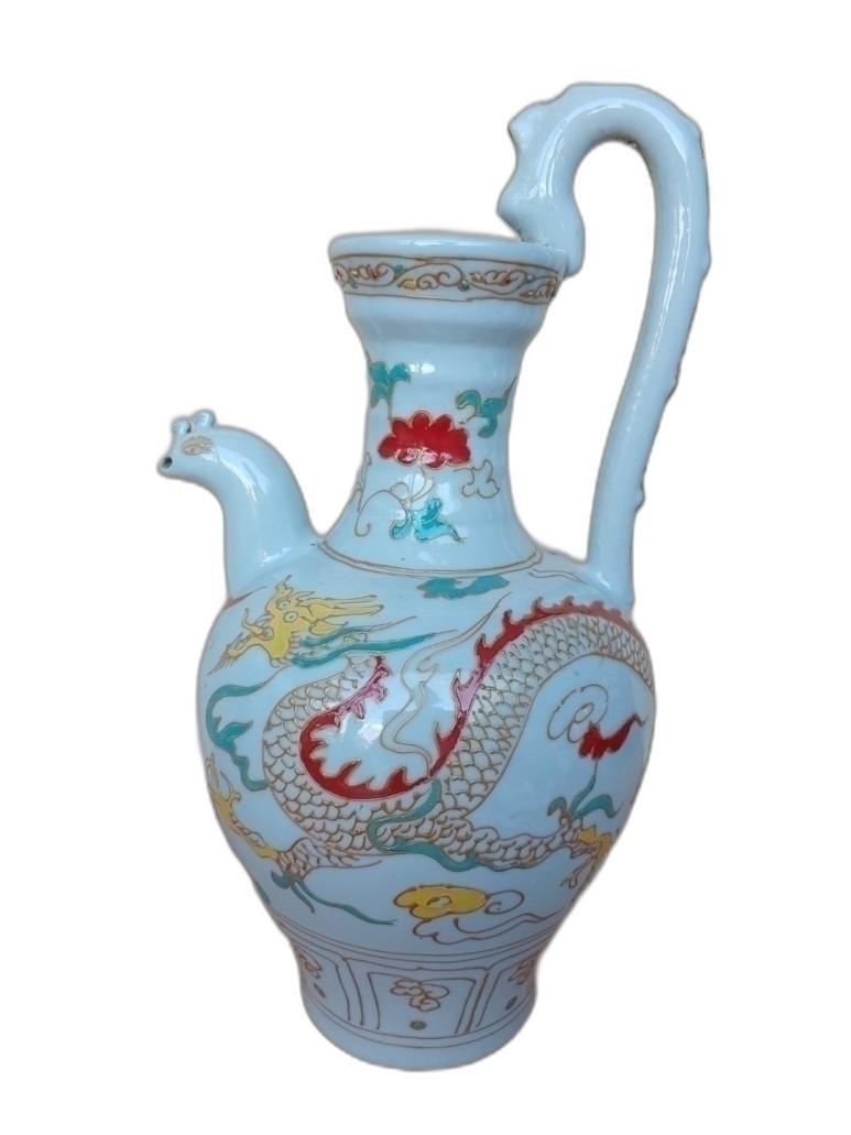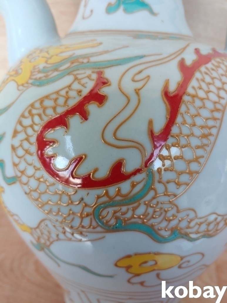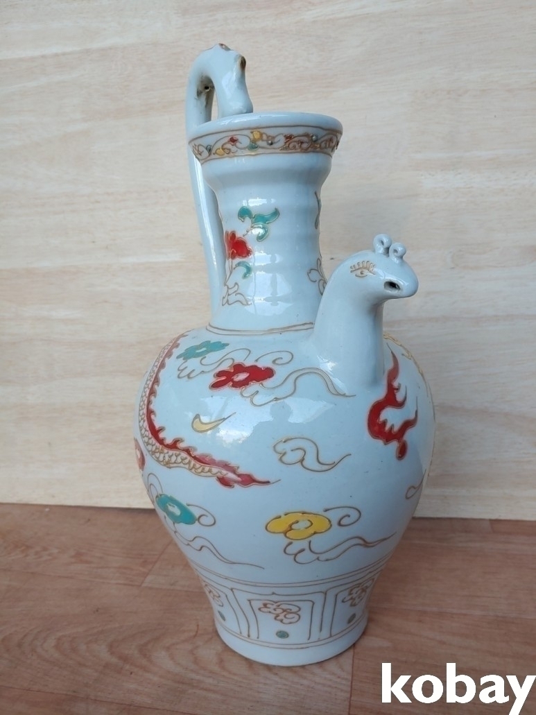 용 문양에 용 손잡이가 있는 주전자 도자기 입니다.