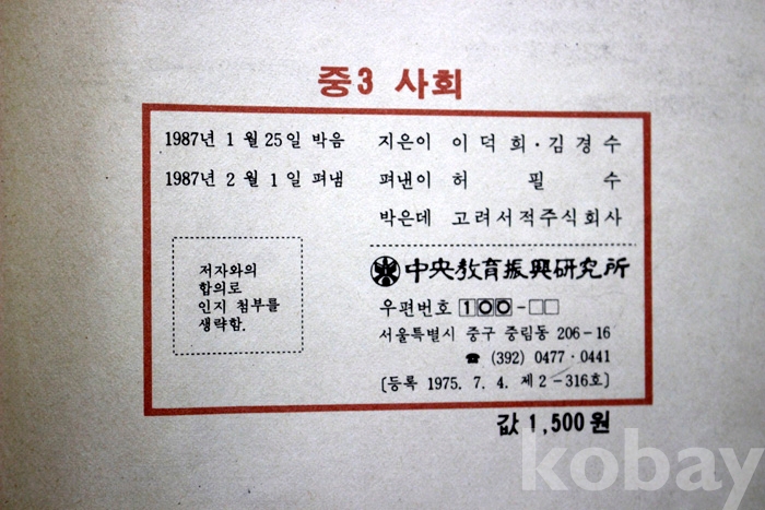 중앙교육평가문항집 : 중 3 사회 - 1987년 중앙교육진흥연구소 발행