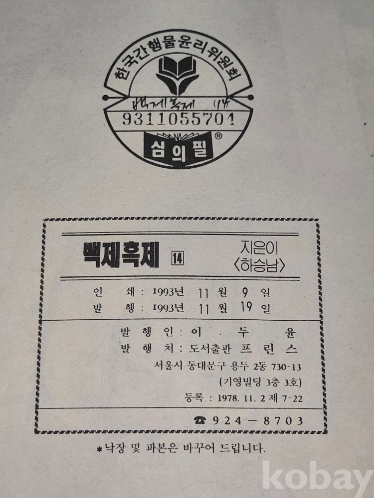 80-90년대 만화방 == 하승남 글.그림 == 백제흑제 14권 완질