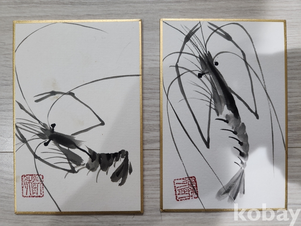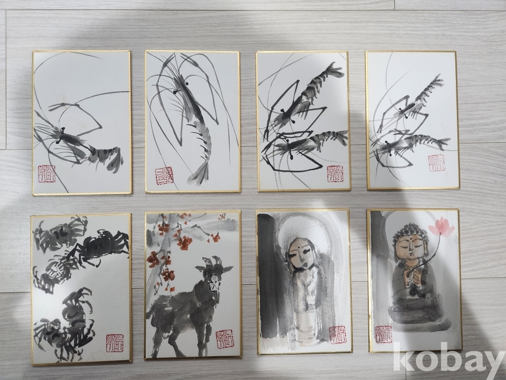 상단 4점은 새우·게 등 어해도를 절제된 선과 농담만으로 표현해 수묵의 맛과 생동감을 담았으며, 하단 4점은 염소, 선인상, 불상 등 인물·동물 소재를 친근하게 그려낸 풍속화적 감성이 돋보입니다. 화면의 여백을 살린 구성, 번짐과 농담의 절제 등 금추 선생 특유의 정갈한 표현이 소품임에도 완성도 높게 담겨 있습니다. 전체 작품의 보존 상태는 양호합니다.