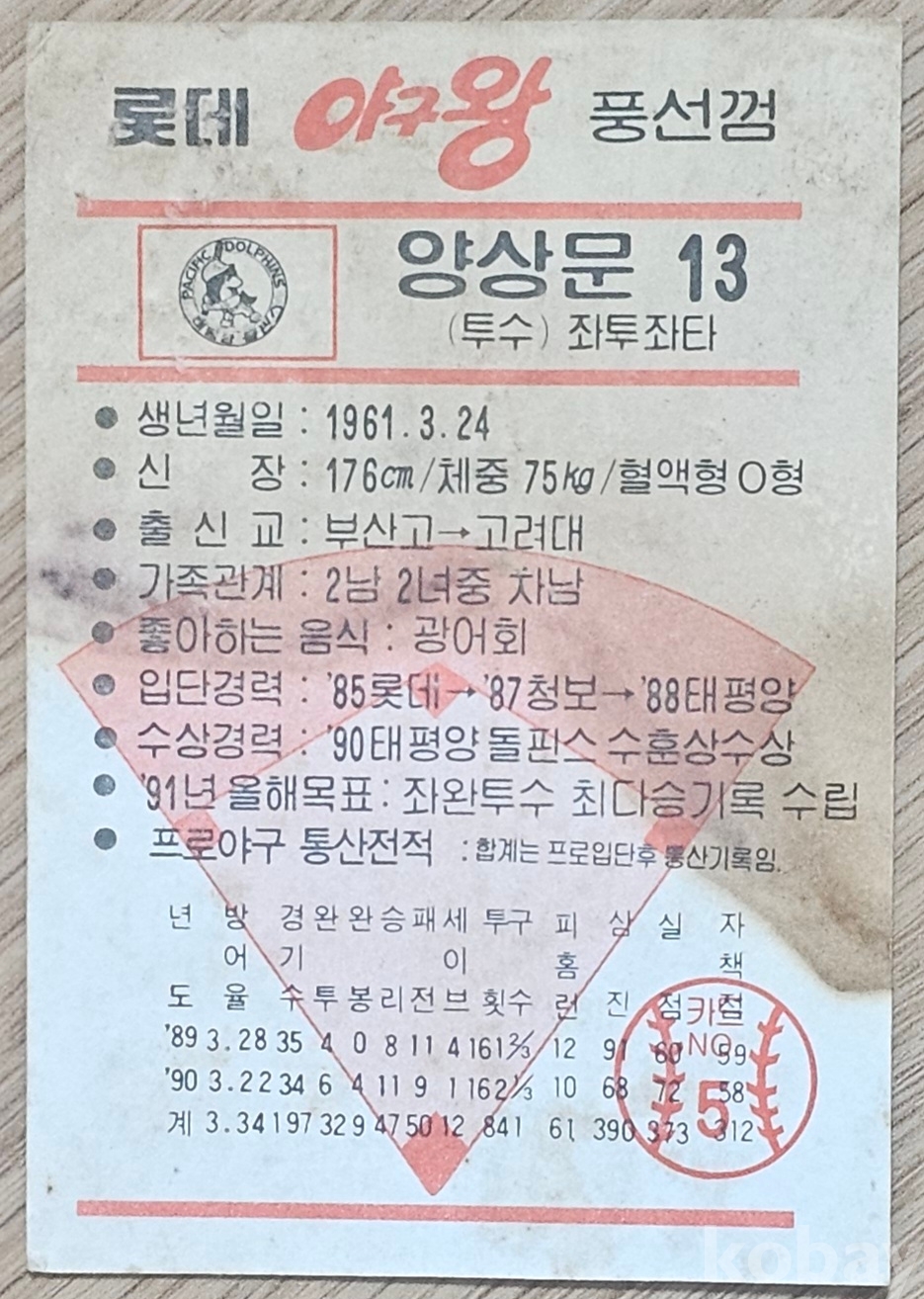 1991년 프로야구 태평양 돌핀스 양상문 선수 스포츠카드
