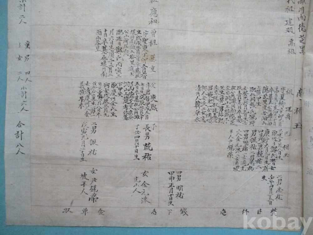 간행하는 족보에 올리고자 가족들의 인적사항을 세필로 필사해 기록한 물품 총 8장입니다