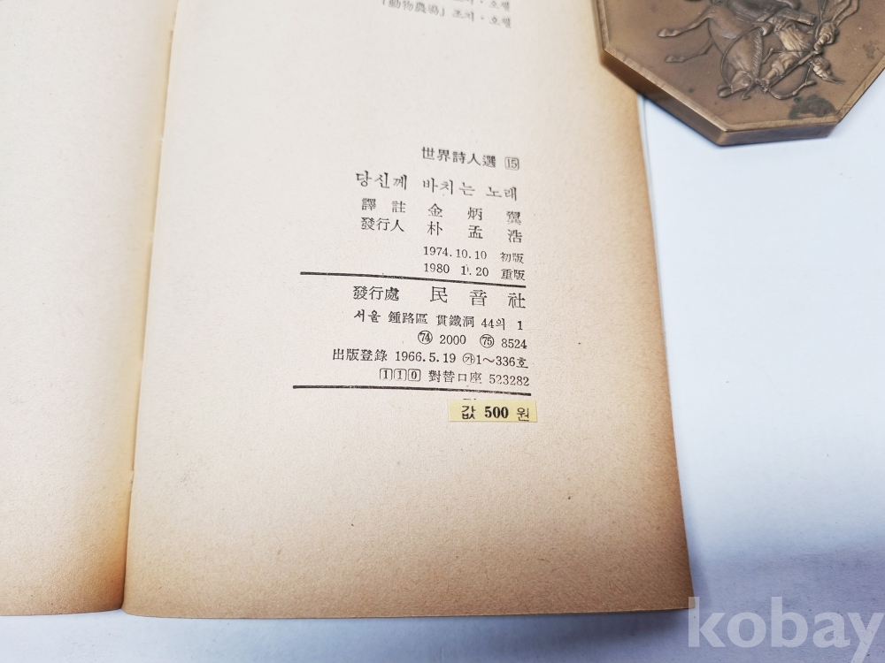 [묻지마 천원 경매] YBK21 민음사 당신께 바치는 노래 라빈드라나트 타고르 1980
