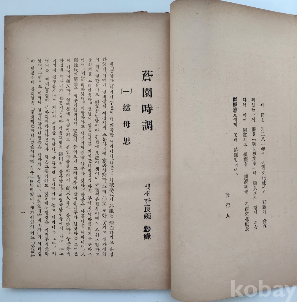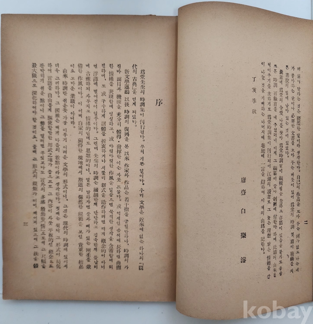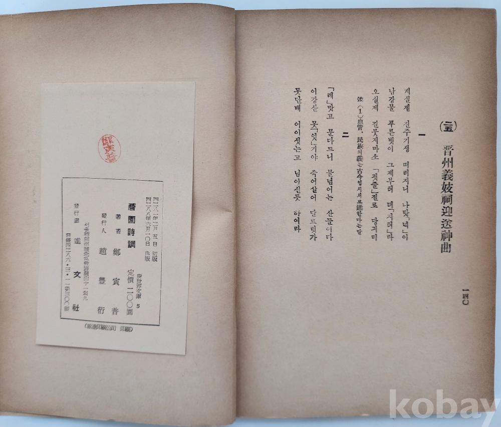 자료명/ 저자/ 발행/ 형태사항 | (新世界文庫; 5) 『담원시조 · 薝園時調』 , 정인보(鄭寅普, 1893~1950) 著, 서울: 進文社, 1955.6.10._재판, 140p., 변색 및 얼룩. |
