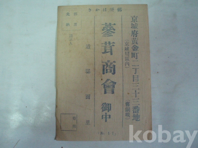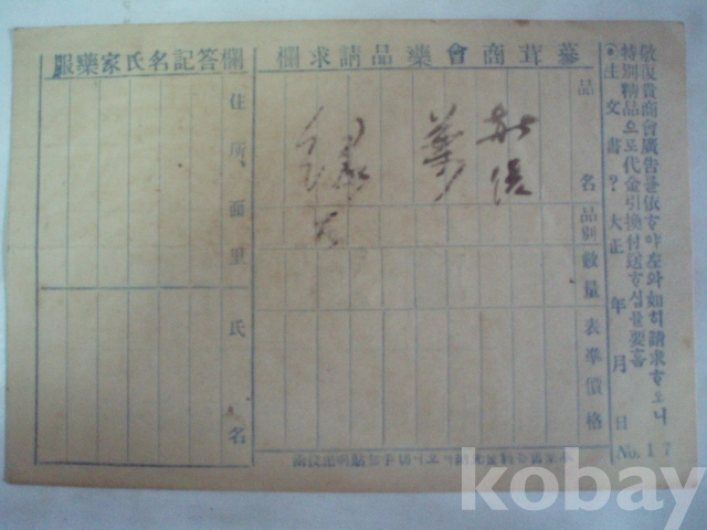 삼용상회 (蔘茸商會, 경성부 황금정) - 약품청구 우편엽서 (일제강점기 대정년간)
