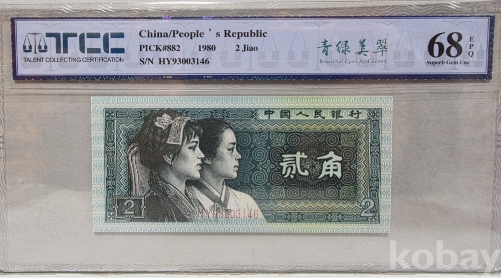 -1980년 중국 인민은행 발행 2각 지폐 TCC68 고등급 입니다.