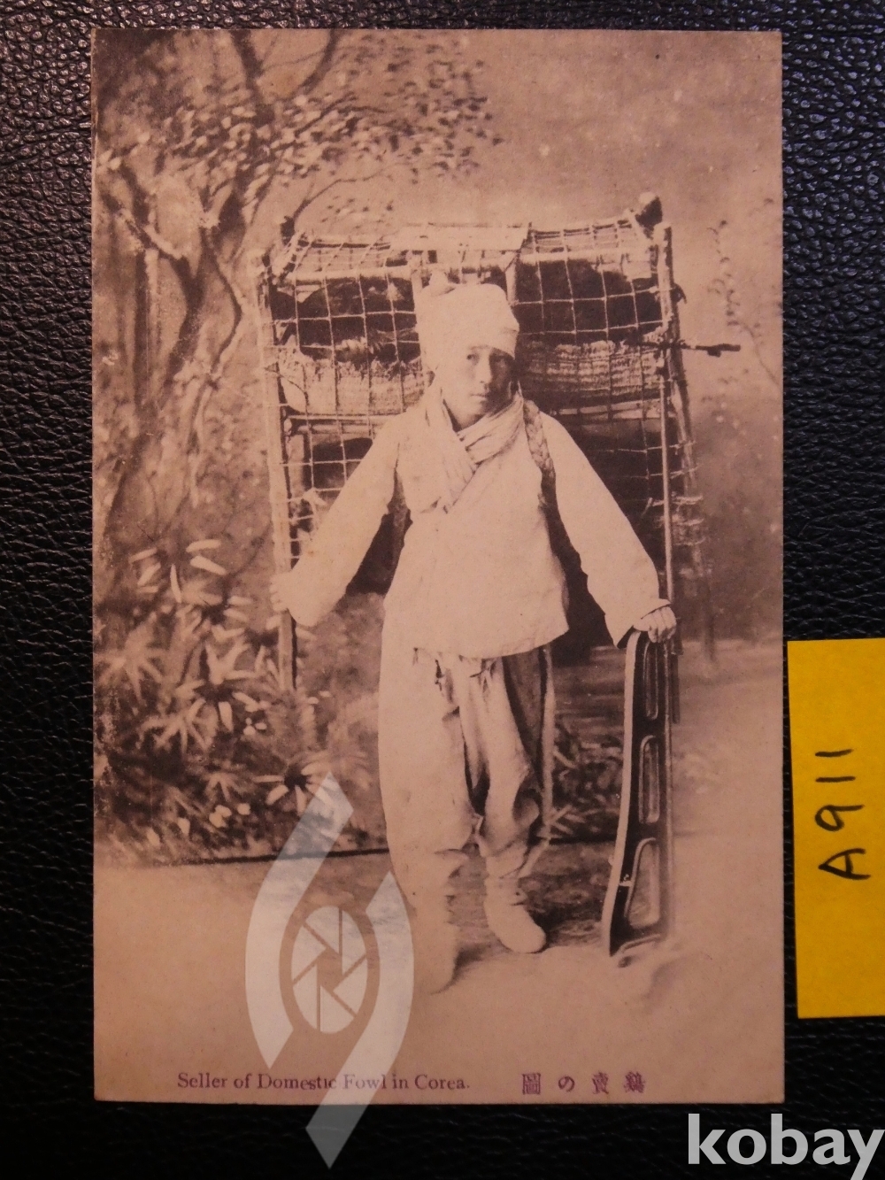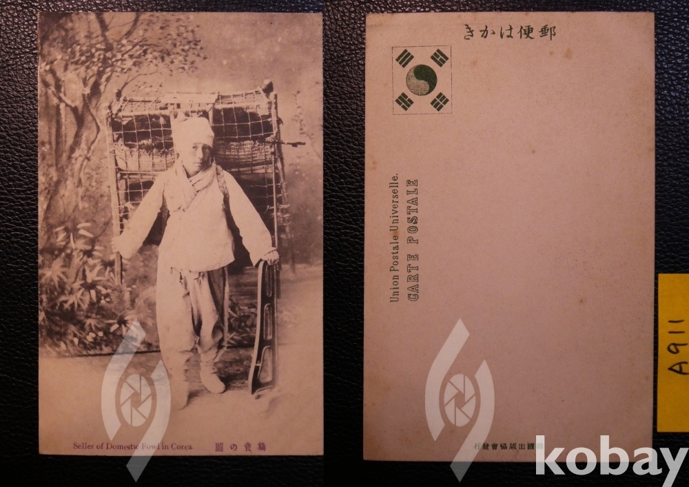 ▣근대한국엽서(진본): 대한제국기, 지게를 지고 닭을 팔러 다느는 상인 모습, 뒷면에 태극기 마크, 일제강점기 이전 엽서임, 희귀/1매.