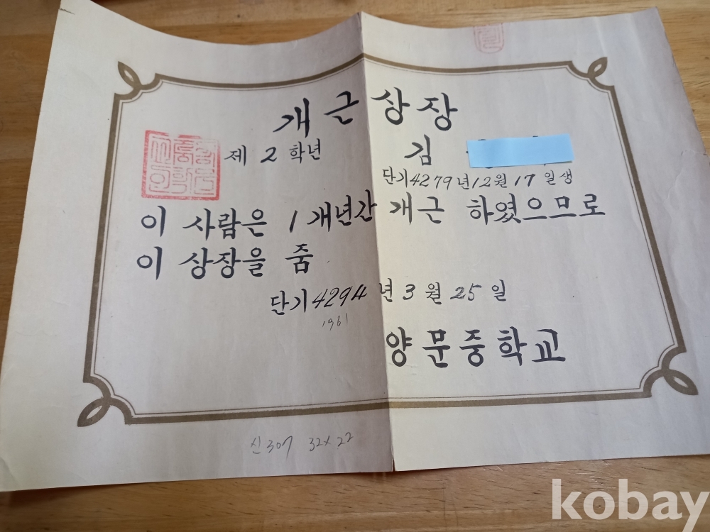 신 307) 양문 중학교 개근상장 단기 4294년
