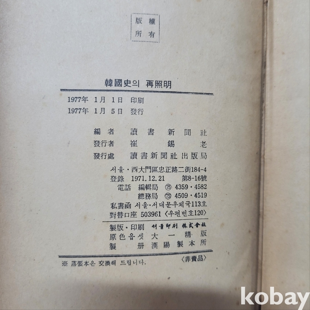 [희귀본] 한국사의 재조명 (1977년 독서신문사 초판본) ; 중급/서고I04