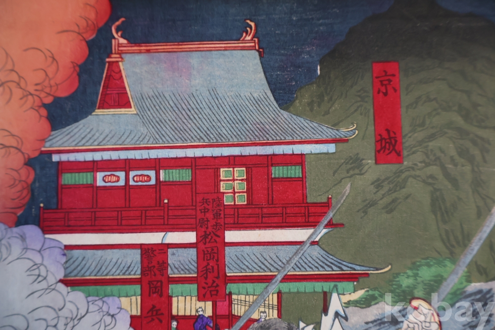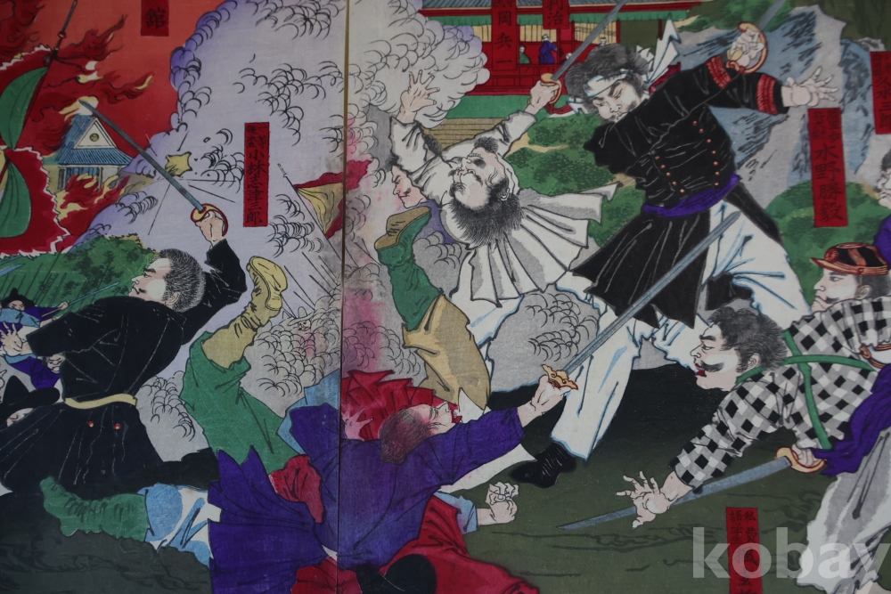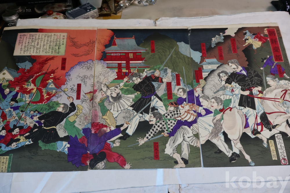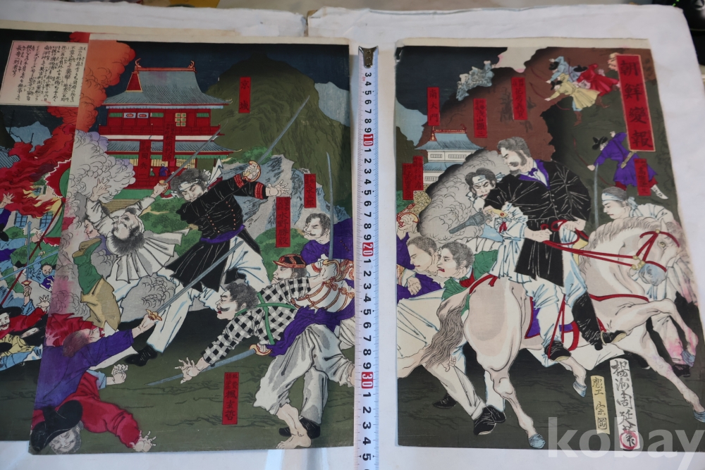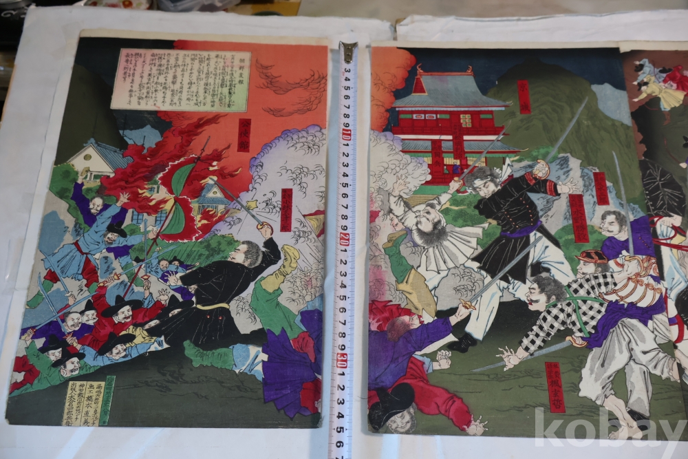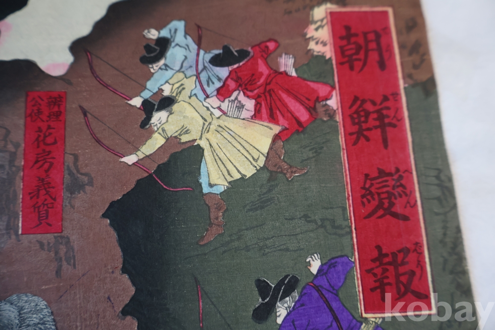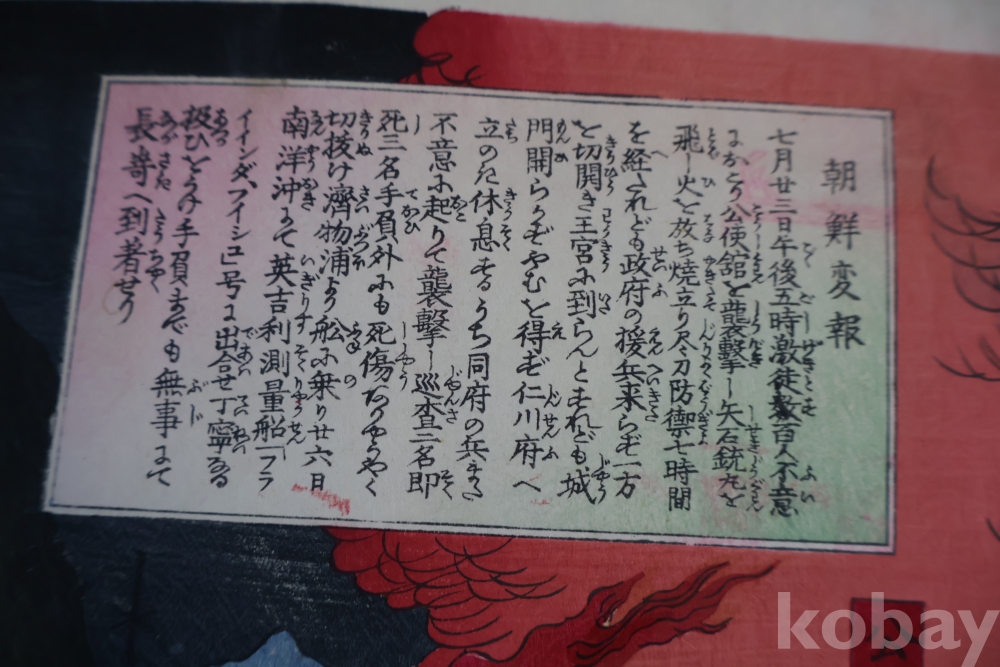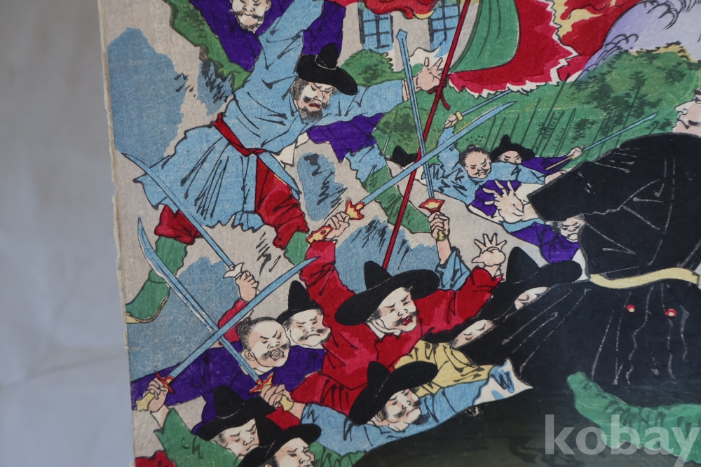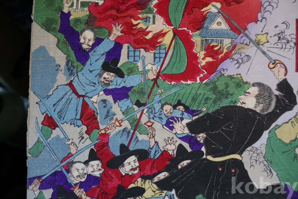 역사적 사실을 알린 일본 목판화 원본 임니다 제작 년도 사건 내용을 가진 명물 임니다 임오군란의 일본 영사관 전투도 임니다 1882 /// 명치 15