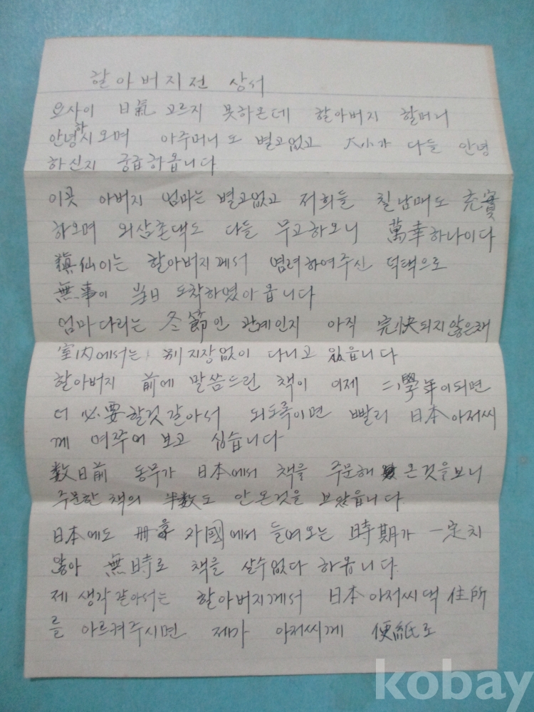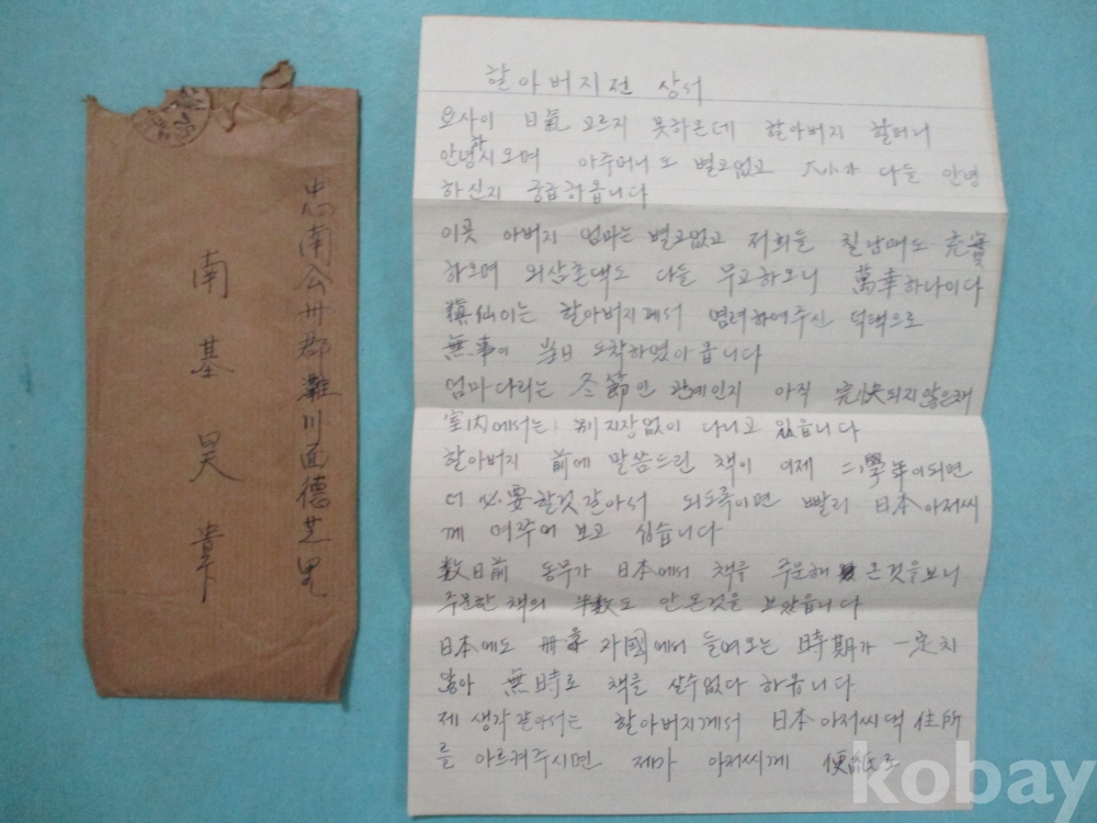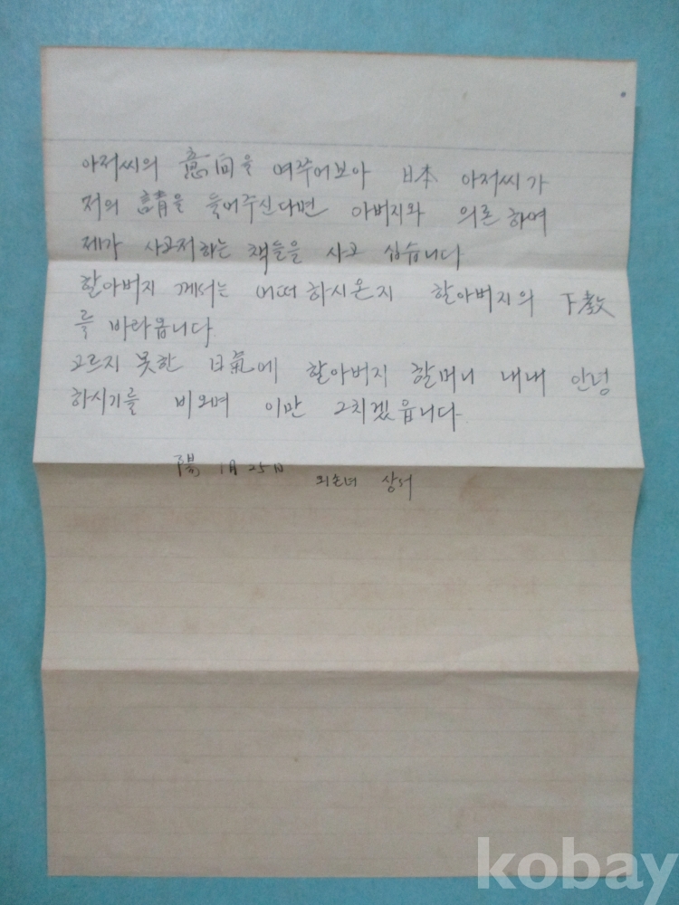 양식지에 쓰인 1959년 1월 25일에 남상돈선생의 1녀 최정규님의 따님인 외손녀(최진경)가 쓴 국,한 혼용의 간찰