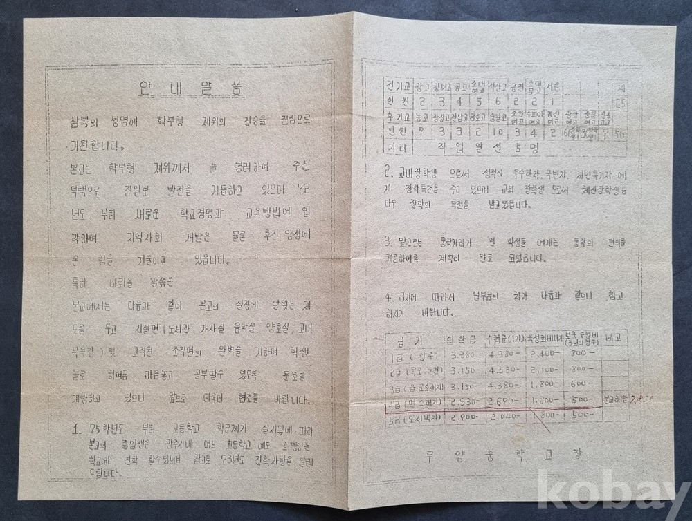 희소성: 당시 흔하게 버려졌을 학교 가정통신문이지만, '75년 학군제 실시'라는 시대적 상황과 세밀한 금액표가 남아있어 사료적 가치가 높습니다.