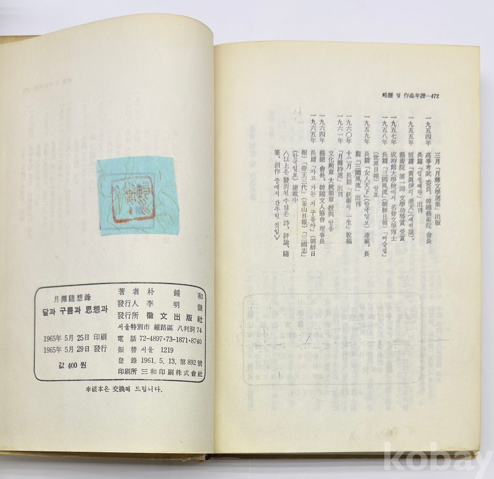 물 품 명 | <좋-았書! 1탄> [1] 1965년 휘문출판사 발행, 박종화 [달과 구름과 사상과] 초판본 1책 | |||||