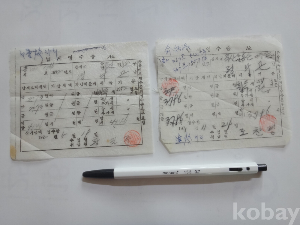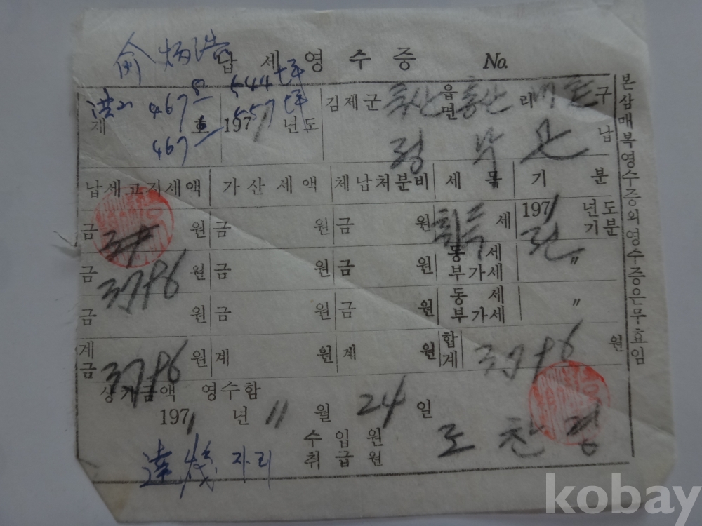 김제군 취득세 등 - 영수증 2매일괄 (본 삼매복 영수증외 영수증은 무효임. 1971년, 1972년)