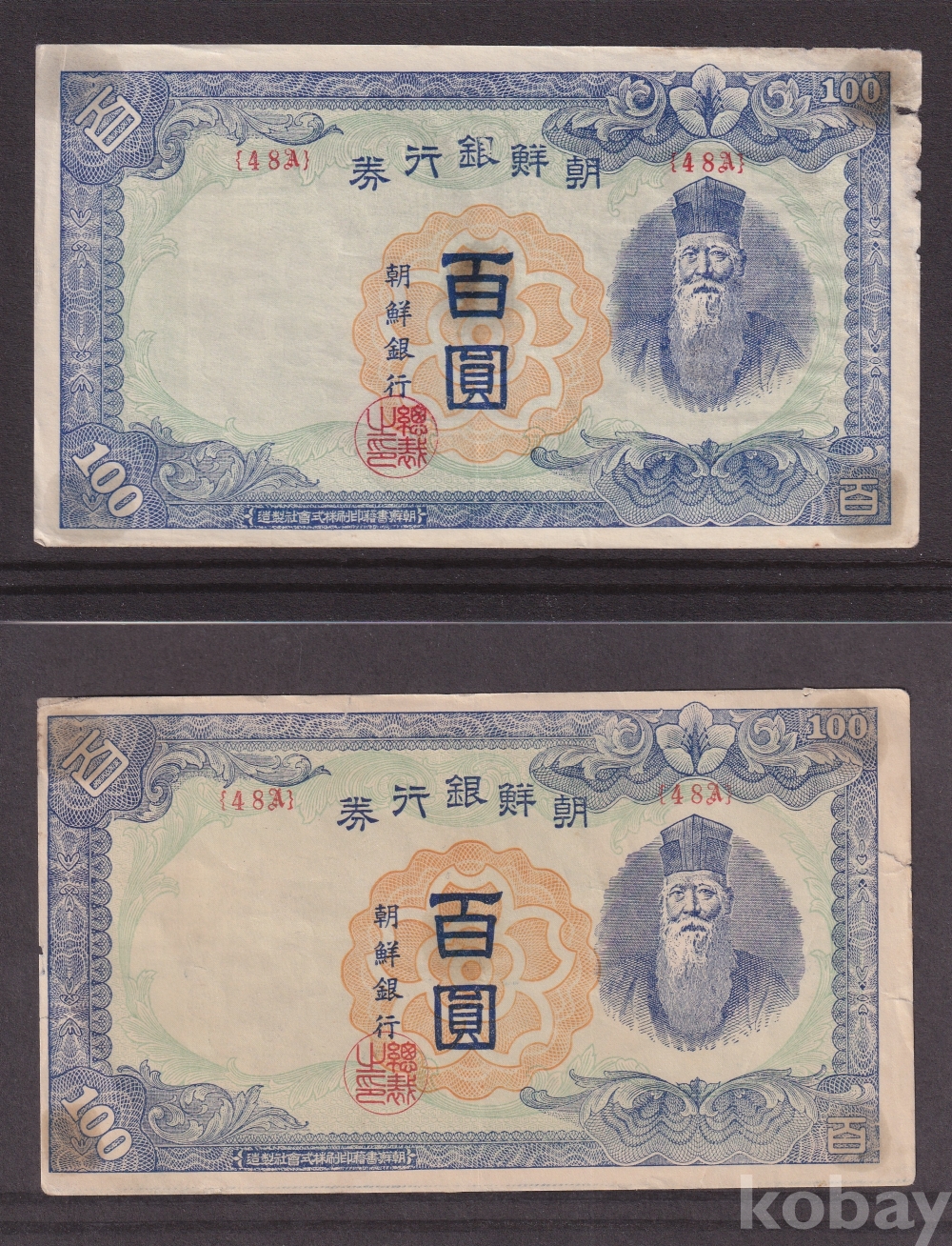 - 조선은행 1947년 무백원 판번호 48A 사용제 지폐 - 2장 일괄