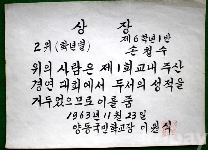 (상장 및 졸업장) 1963년 양동국민학교의 상장 - 제1회 교내주산경연대회 2위 (학년별)