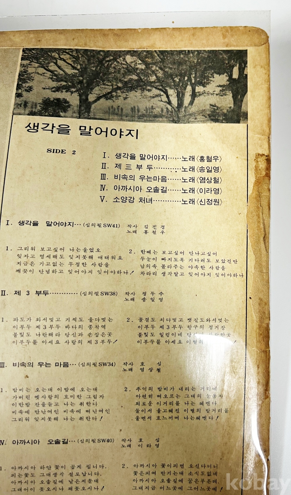 상품 설명 | Side A 1. 별이 우는 이 밤에 2. 허수아비 처럼 3. 영시 싸이렌 4. 해변의 추억 5. 검은 발자국 Side B 1. 생각을 말어야지 2. 제三부두 3. 비속의 우는마음 4. 아까시아 오솔길 5. 소양강 처녀 | ||