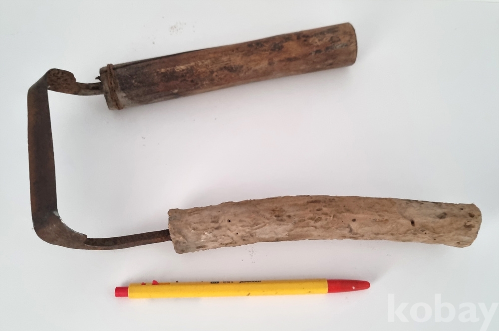 낫은 한 손으로 쓰지만, 이 도구는 양손의 힘을 고르게 실어 일정하고 깊게 깎아낼 수 있는 것이 특징입니다.