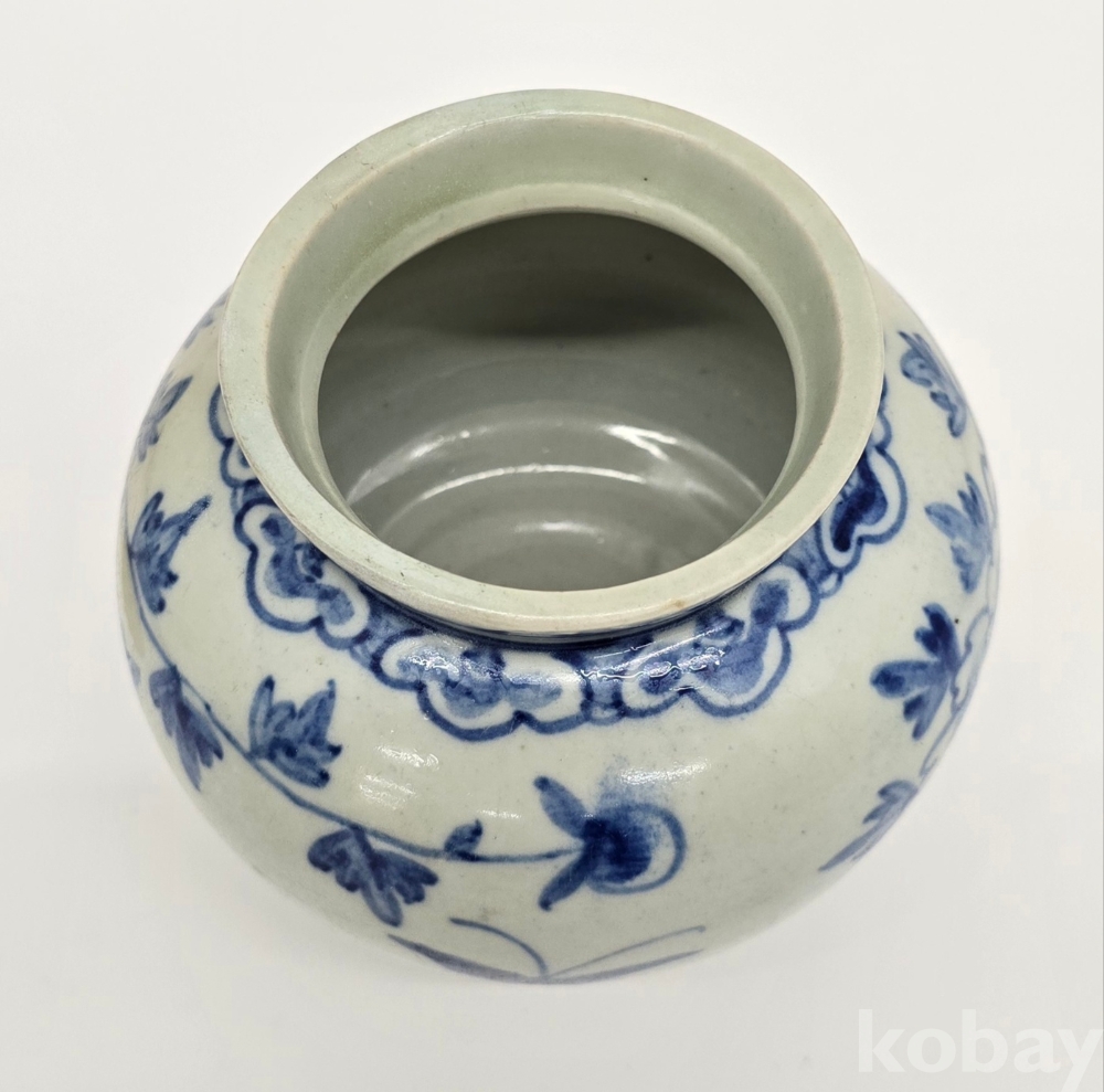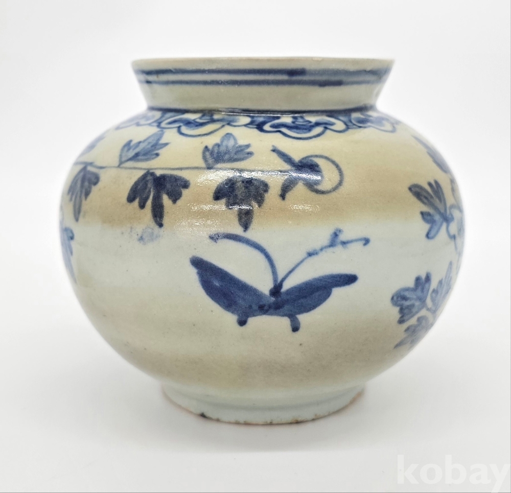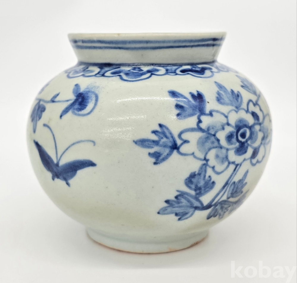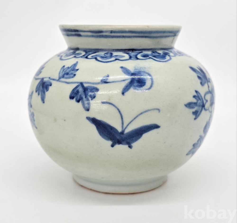 나비도 2마리가 시문되어 있으며, 어깨에는 여의두문이 그리고 구연부에는 청화로 분원띠를 2줄 감았습니다.