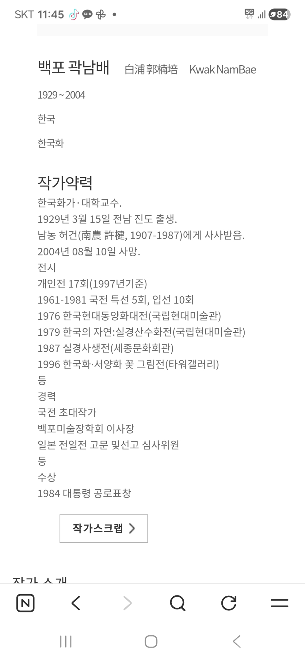 경력 국전 초대작가 백포미술장학회 이사장 일본 전일전 고문 및선고 심사위원