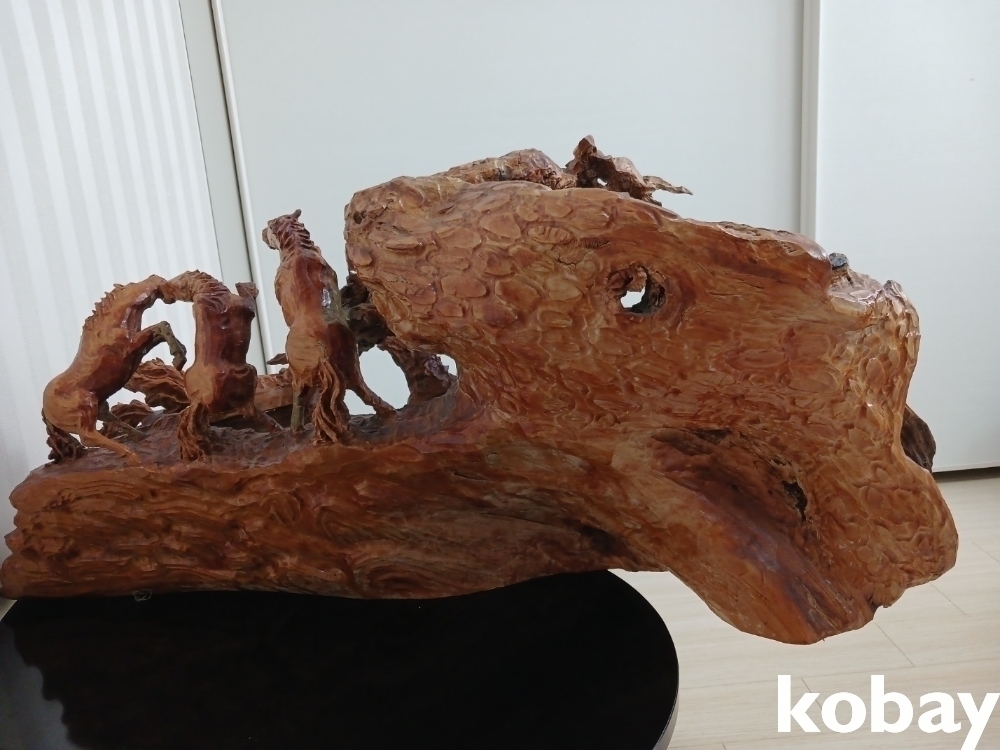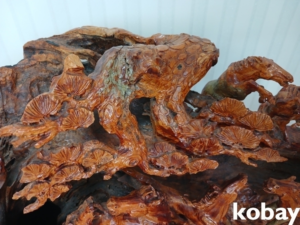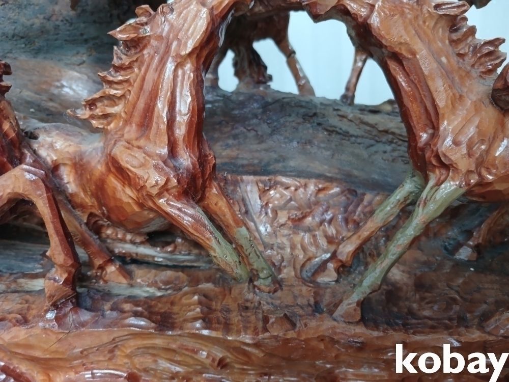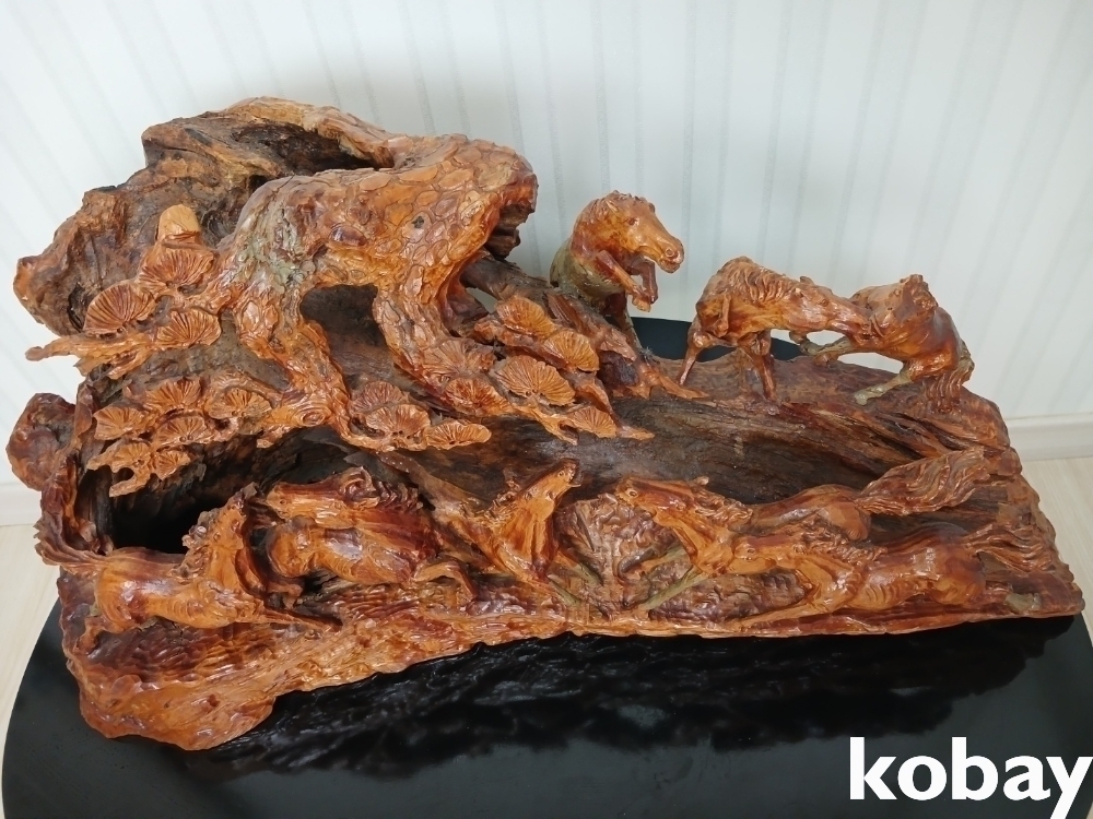 괴목의 통나무에 8마리의 말을 다양한 모습으로 조각하여 표현한 공예품 입니다.