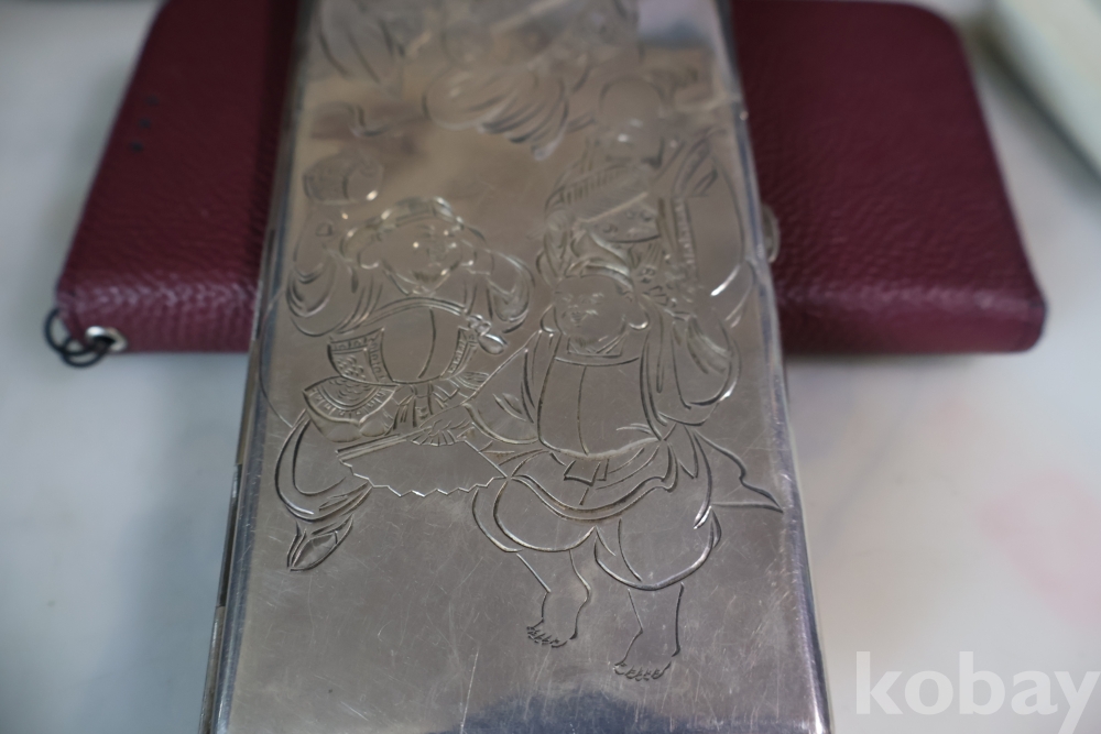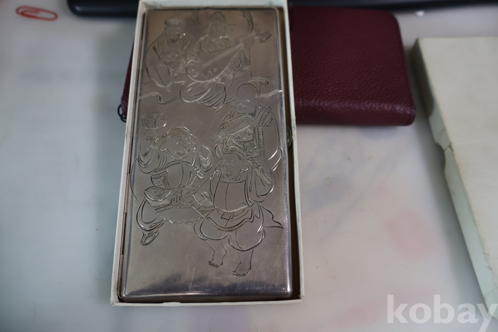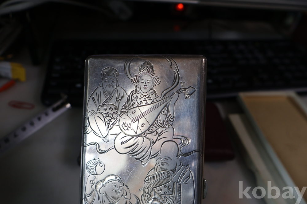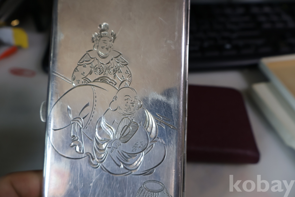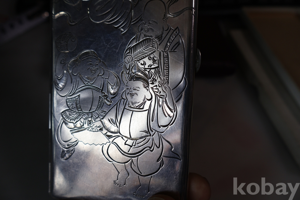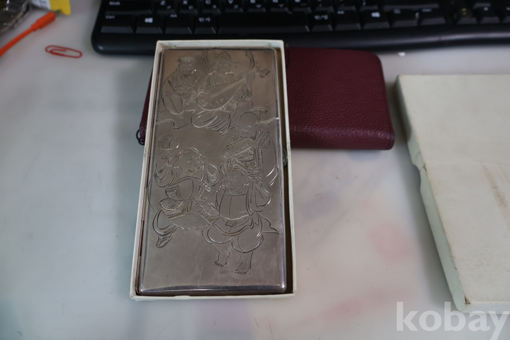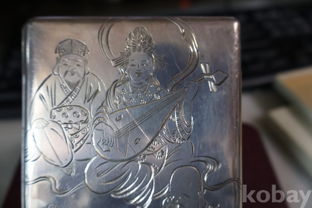 빛반사가 보임니다 일본 은 담배 상자 이며 일본 칠복신의 조각을 가진 당대의 명품 임니다 극히 귀한 명물 임니다 세월의 스크래치가 보이는 명물 임니다