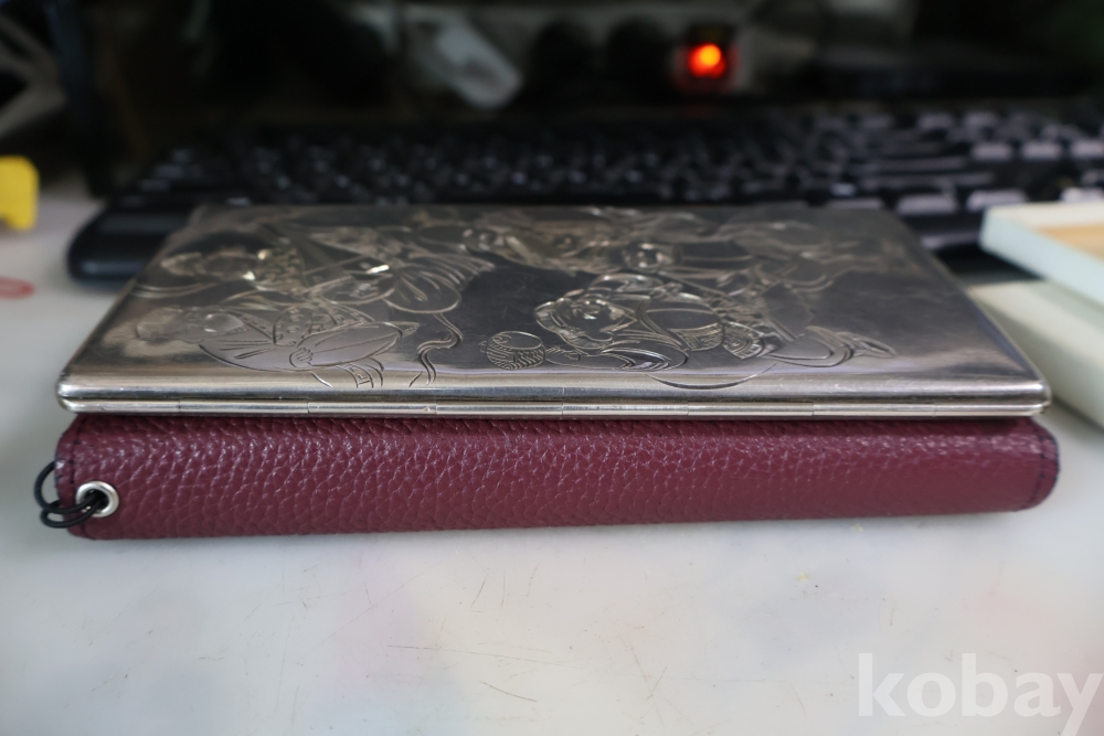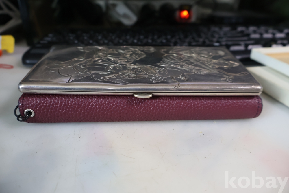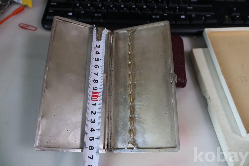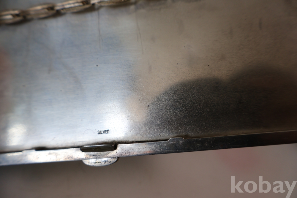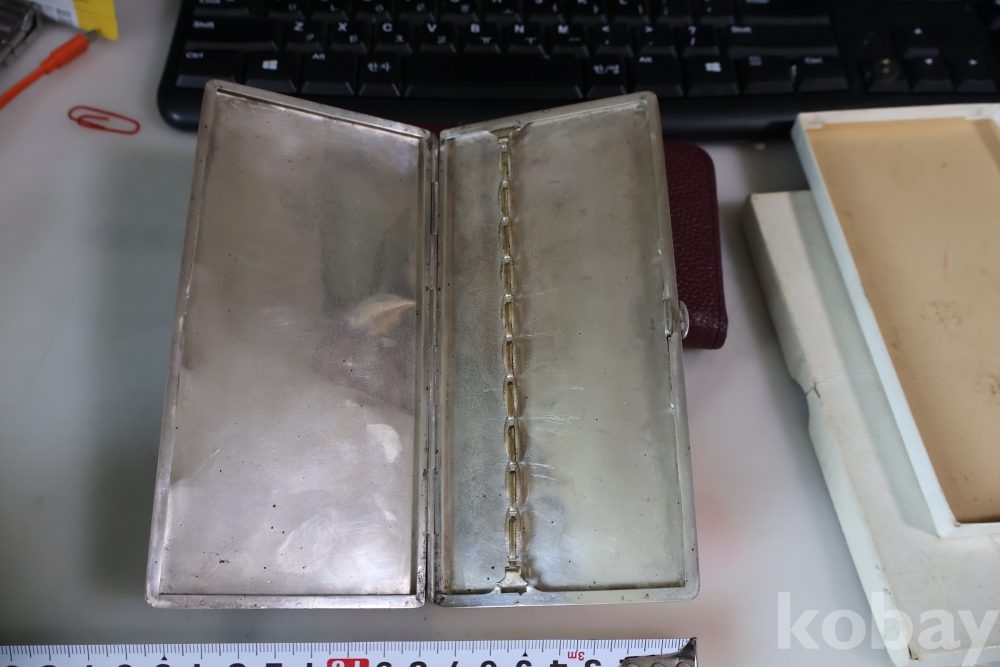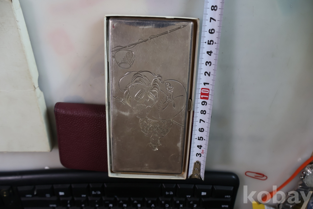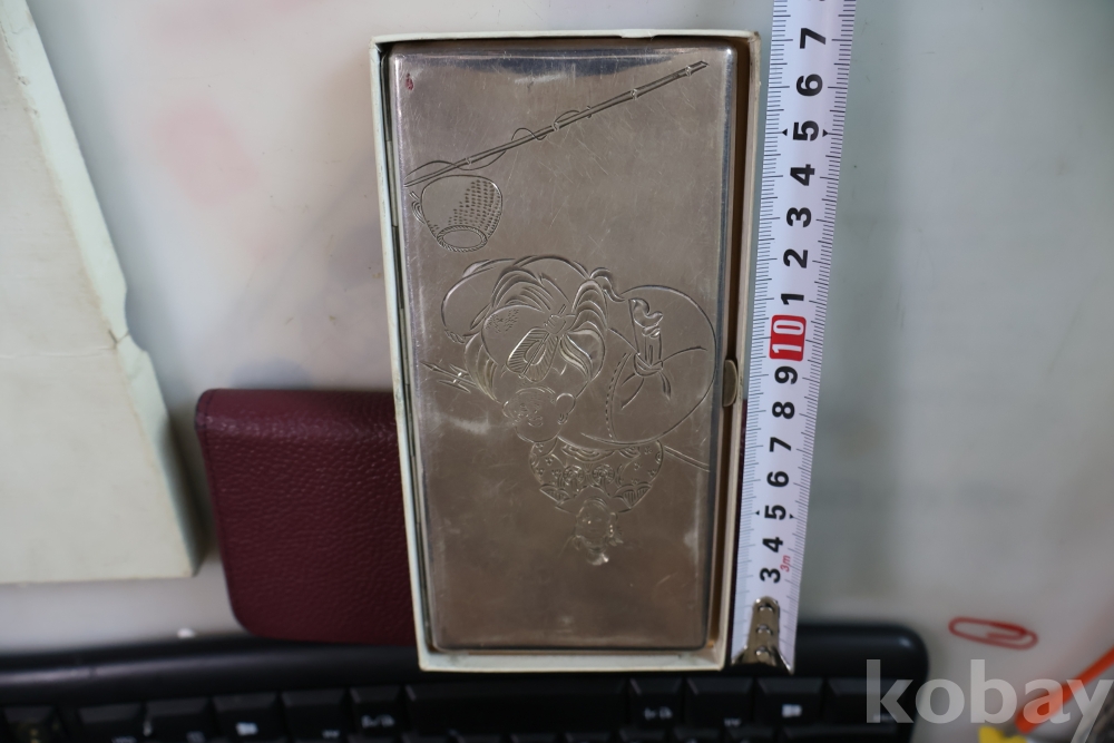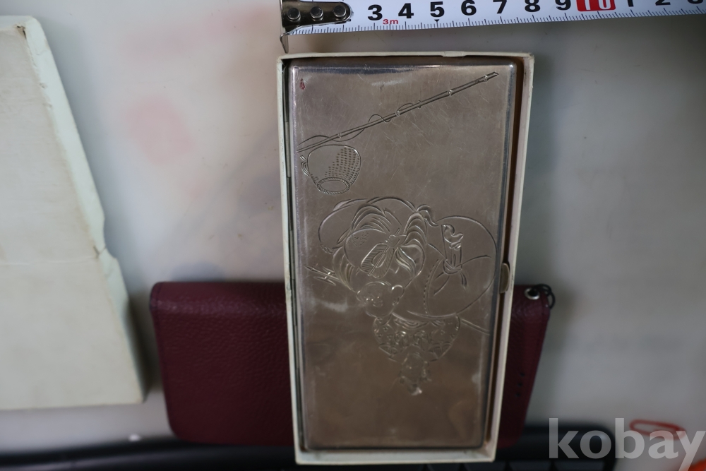 빛반사가 보임니다 일본 은 담배 상자 이며 일본 칠복신의 조각을 가진 당대의 명품 임니다 극히 귀한 명물 임니다 세월의 스크래치가 보이는 명물 임니다