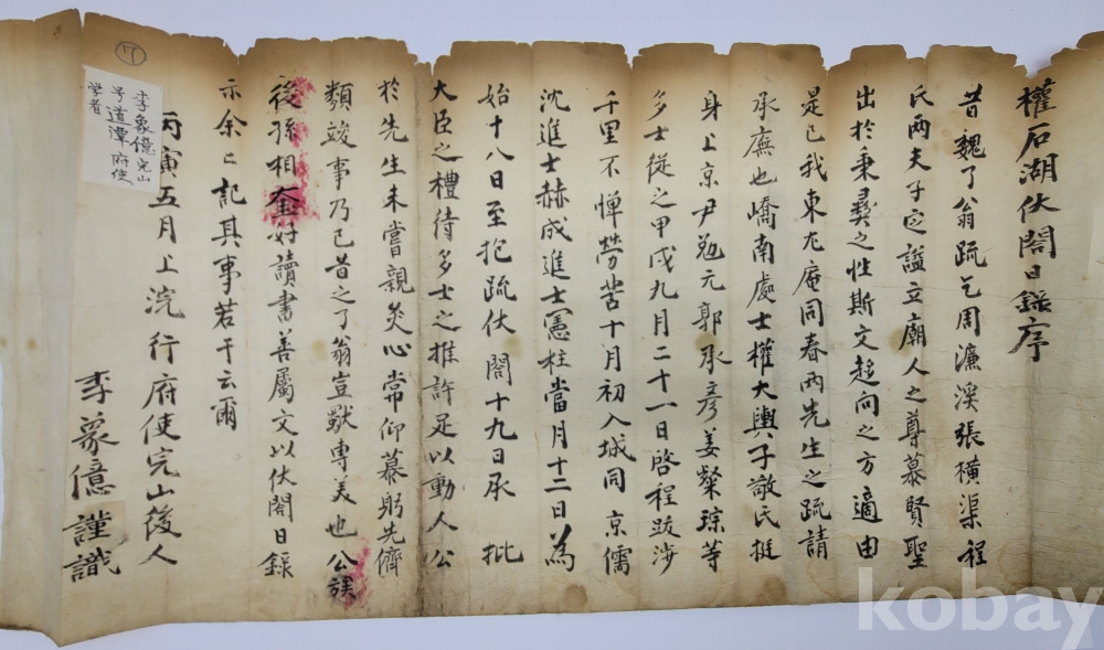 기문은 당시 밀양부사였던 이상억 선생이 1866년 음력 5월 상순에 교남처사(嶠南處士) 권대여(權大輿)를 위해서 지어준 것으로, 제목은 ‘권석호복합일록서(權石湖伏閤日錄序)’이다.
