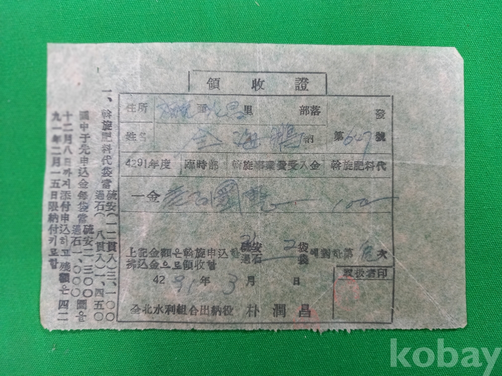 이 문서는 '알선비료대 영수증(斡旋肥料代 領收證)'으로, 농가에 공급된 비료 대금을 납부했음을 증명하는 서류입니다. 1950년대 후반 한국 농촌의 경제 활동과 당시 비료 보급 체계를 보여주는 귀중한 근현대 사료입니다.