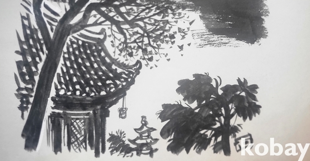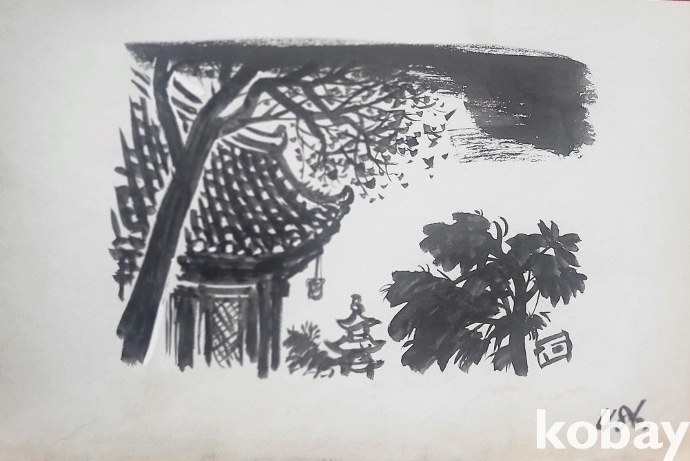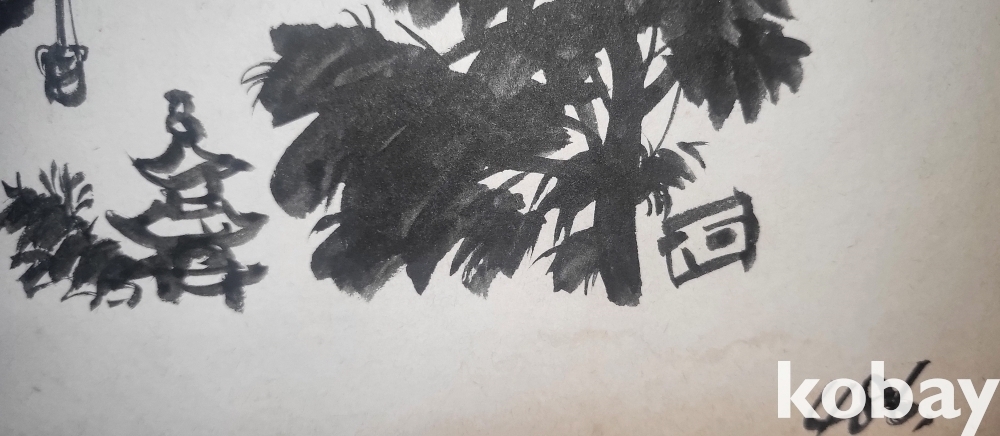 물과 먹으로 만 직접 그려진 수묵화 삽화입니다,