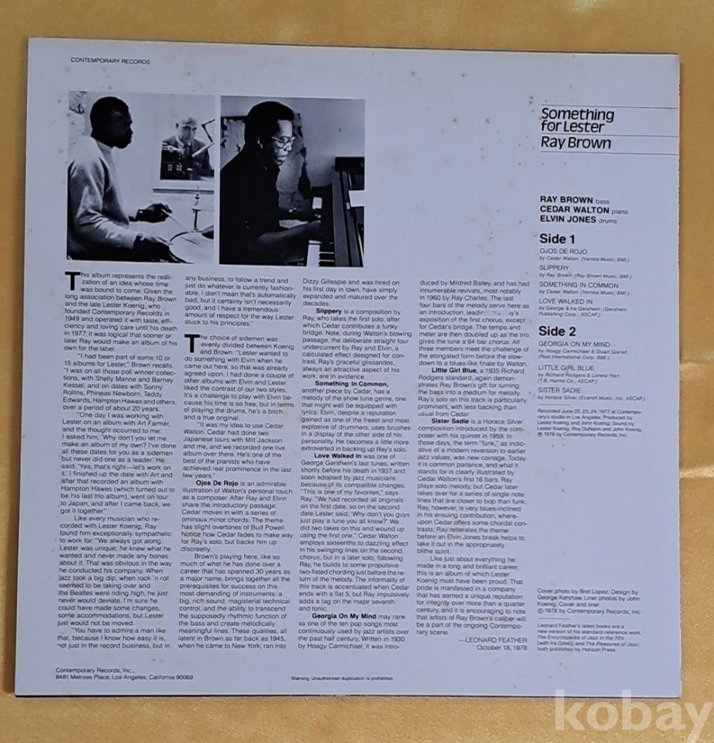 미국의 재즈 베이시스트 레이 브라운(Ray Brown)의 1977년 앨범 'Something for Lester'의 LP 입니다