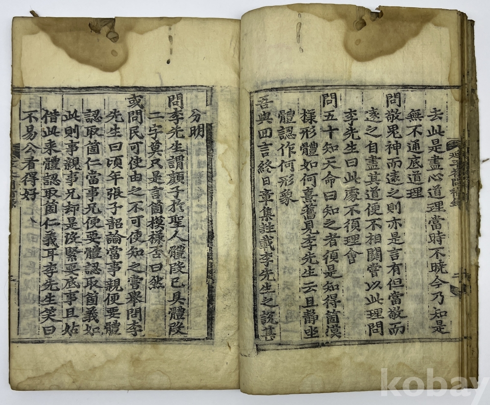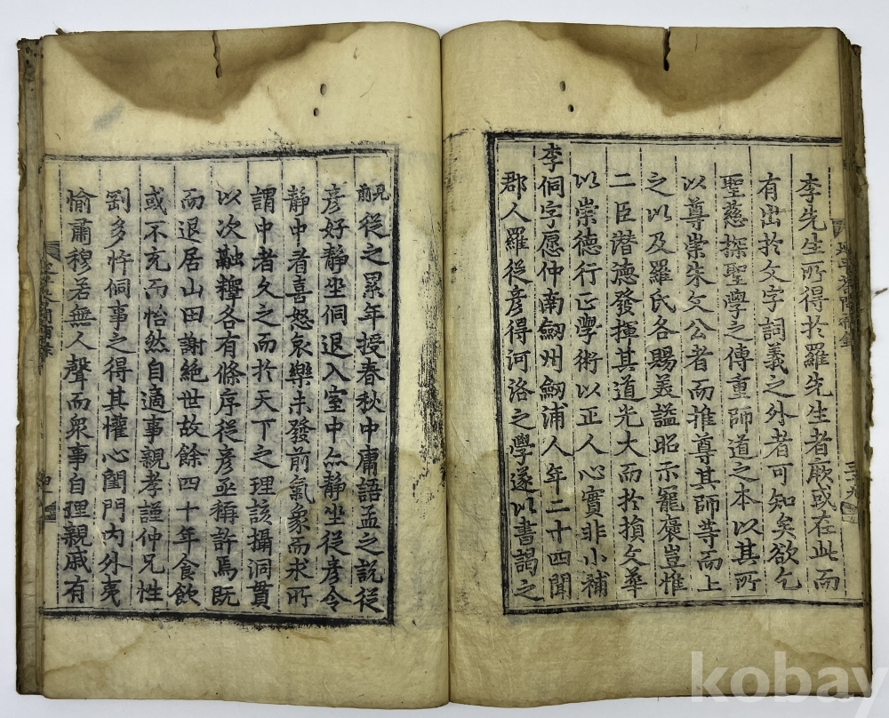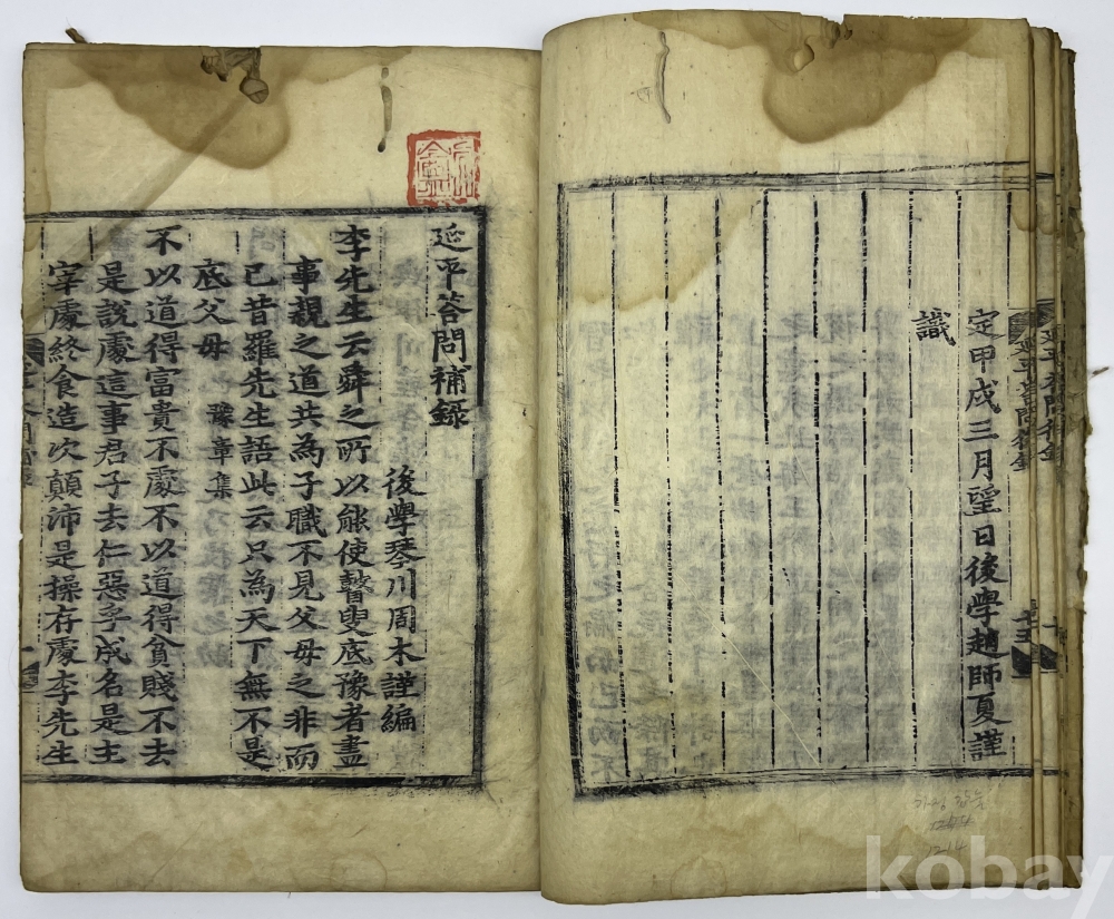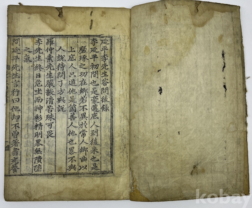 설 명 | 송의 유학자 주희(朱熹)가 스승 이통(李侗)과 나눈 문답을 엮은 ‘연평답문’을 추가한 ‘후록’과 명나라 학자 주목(周木)이 편찬한 보록(補錄)을 엮은 것이다. 조선에서도 이황이 관심을 가져 그의 문인 이정에 의해 1554년 청주간본과 1556년 순천간본 등이 발행되었다. 본 출품물에는 중국에서 성화 연간에 복간된 간본의 내용만을 포함했으며, 이황의 발문은 없다. 말미 ‘成化二一年 七月 日’은 간행 간기가 아니라 명나라 학자 주목(周木)의 상소문이다. 물품번호 24번 | |||||
