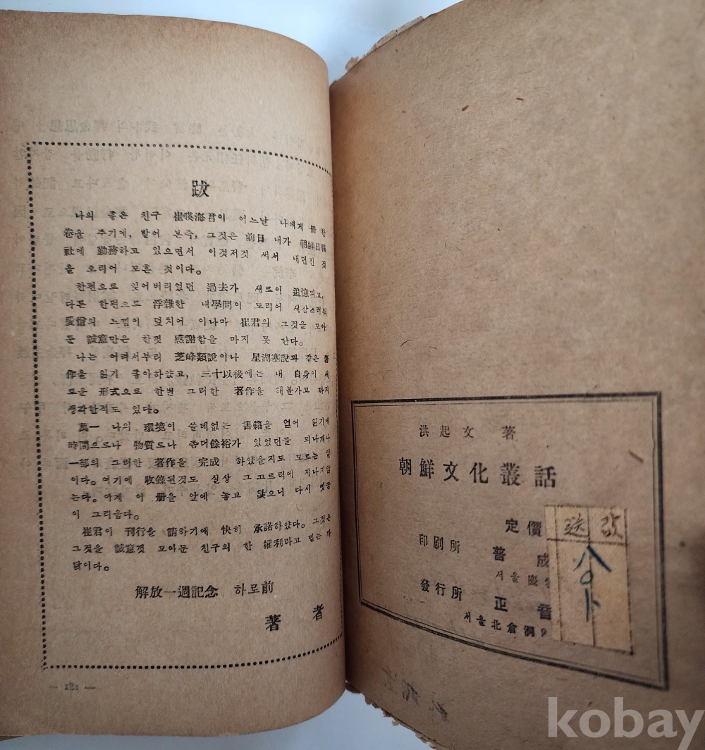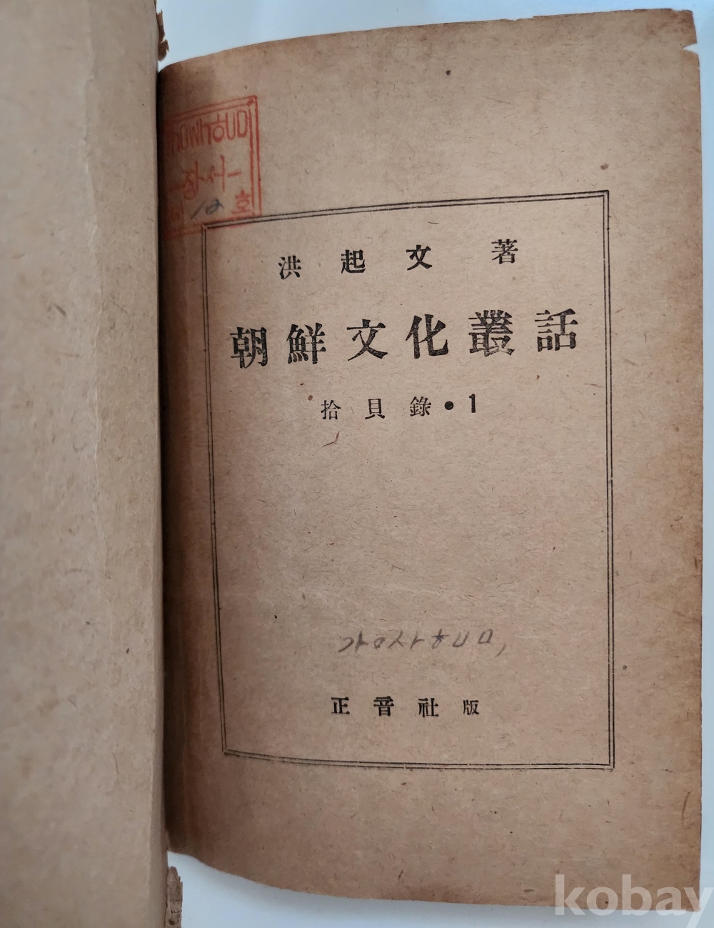 자료명/ 저자/ 발행/ 형태사항 | 『조선문화총화 · 朝鮮文化叢話: 拾貝錄』/ 홍기문(洪起文, 1903~1992) 著/ 서울: 正音社, 1946/ 181p. 얼룩 및 변색. |