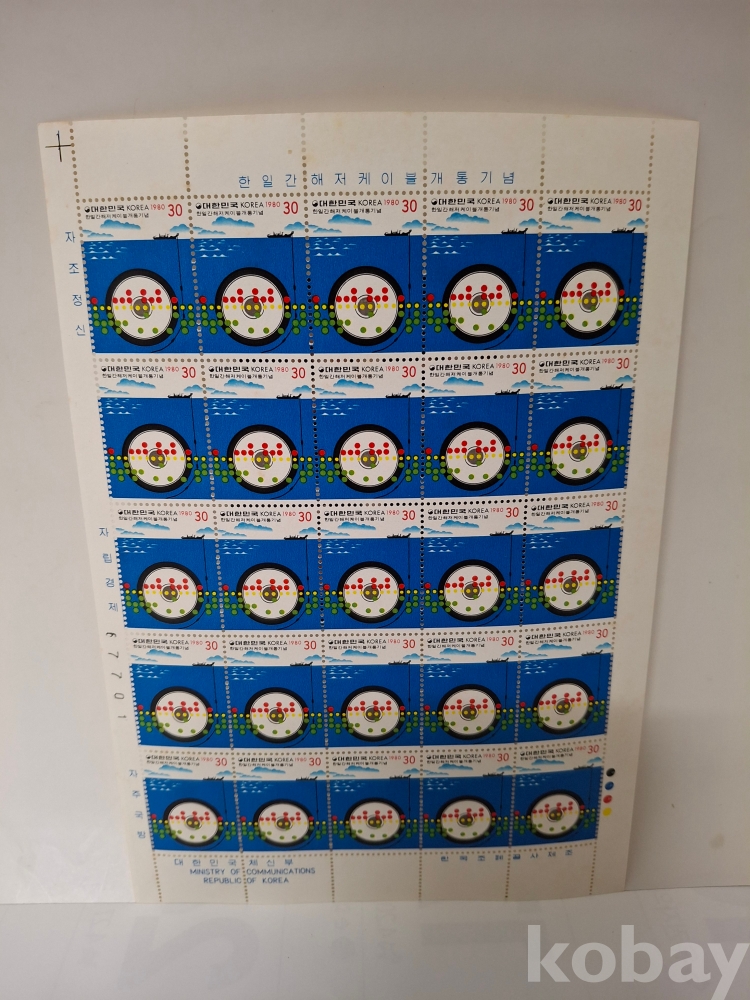 사진속의 유물은 1980년에 발행된 한일간 해저케이블 개통기념 우표 전지입니다