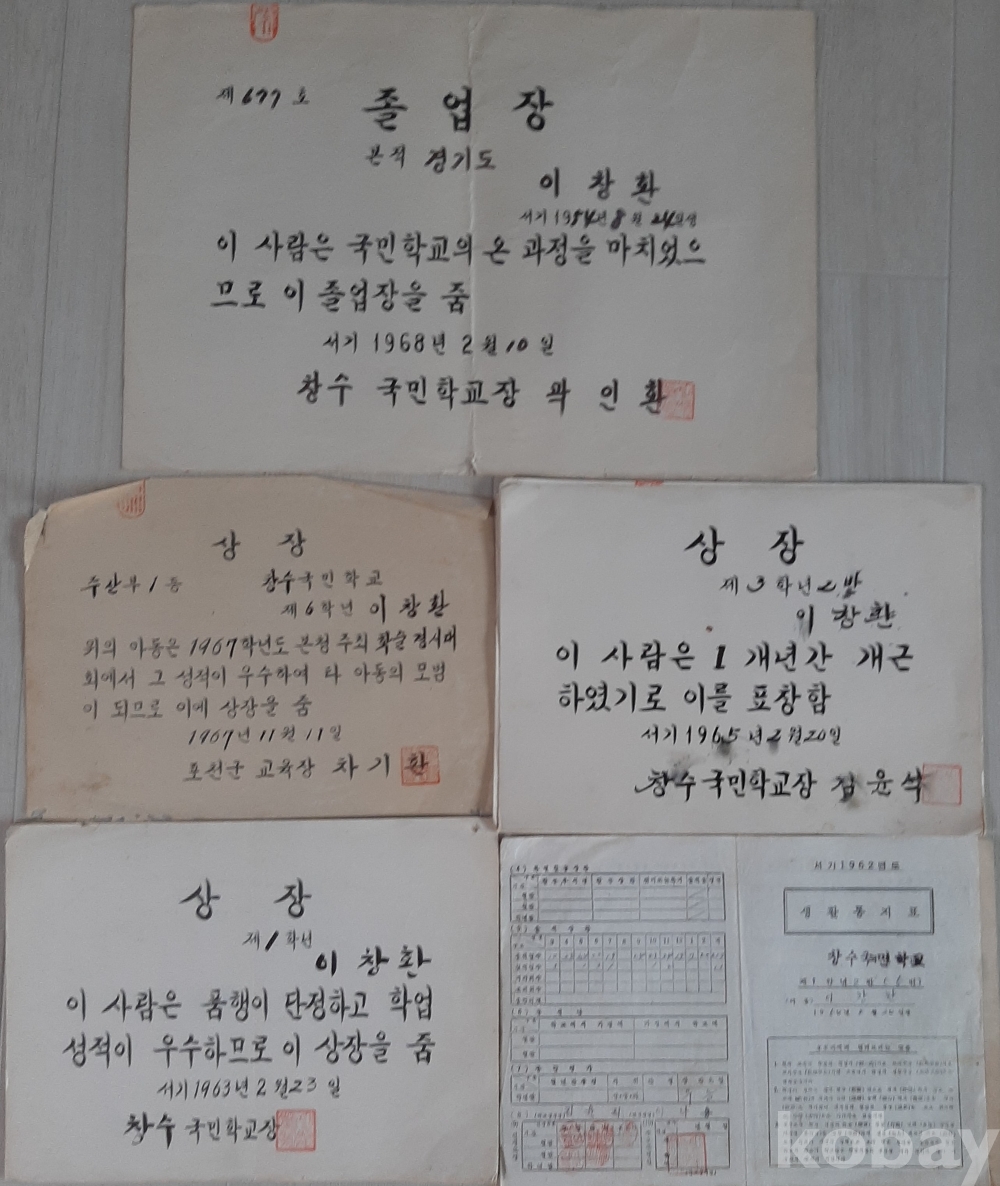 1, 졸업장 1매 2, 주산경시대회 상장 1매 3, 학업우수 상장 5매 4, 개근상장 3매 5, 생활통지표 3매