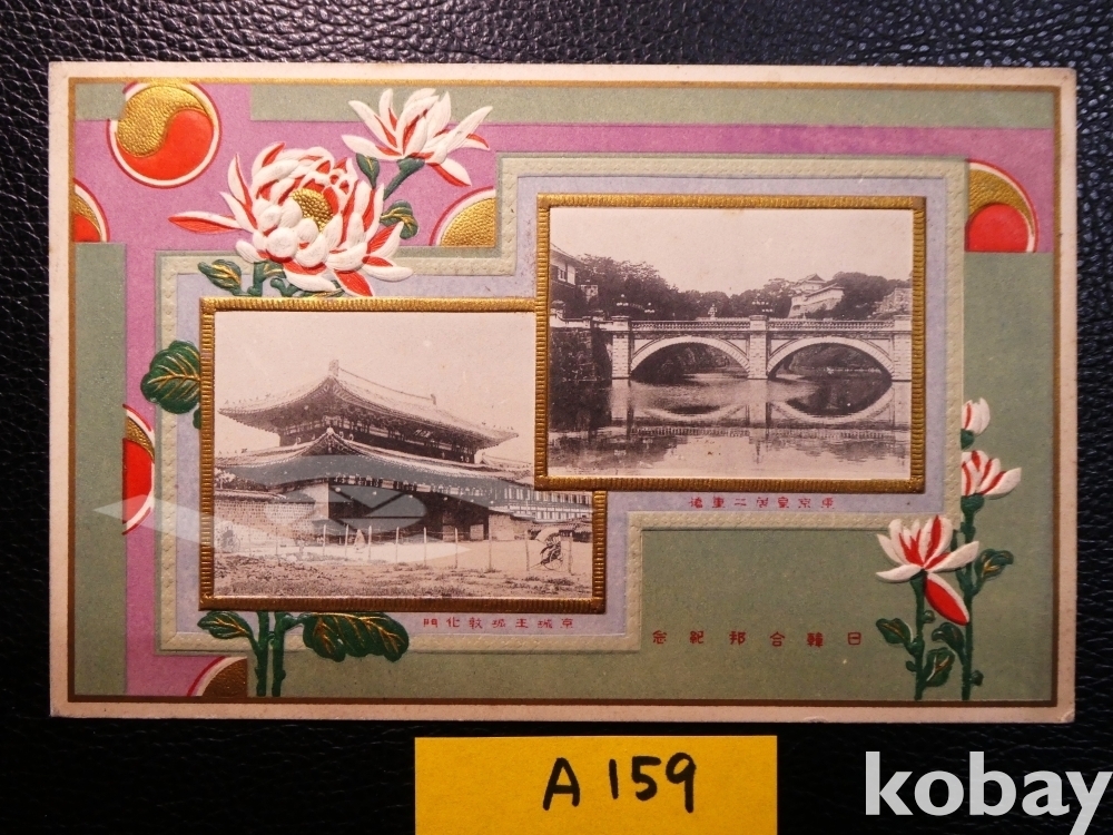 ▣한일합방기념 문구 인쇄, 황거의 이중교, 왕성의 돈화문, 일제강점기 사진엽서, 그림엽서, 회엽서.